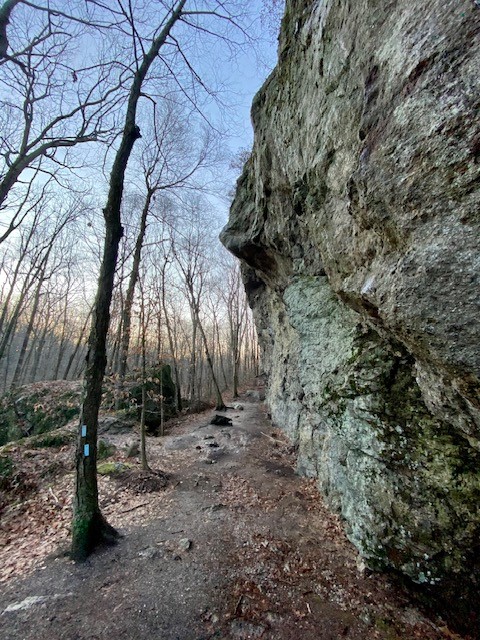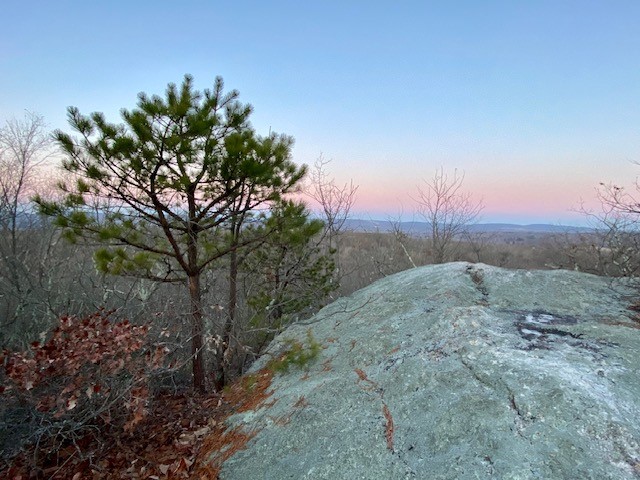 Another option is to hike around Millers Pond adding an out-and-back on the Mattabesett Trail to Bear Rock. I did this as a sunrise hike in January of 2021 and wrote about it in my March 2021 Trail Talk column in the Killingworth Krier. I first learned about it from a Rockfall Foundation blog post (see link below). The Mattabesett Trail is a 62 mile section of blue-blazed trail maintained by the Connecticut Forest & Park Association and it cuts through Millers Pond State Park. For this hike I started at the trailhead on Harvey Road in Durham. Due to luck of timing and topography I watched the sun rise both from the ridge above Bear Rock and again, 35 minutes later, from the shore of Millers Pond! (Bear Rock itself faces west, and I have since returned for a sunset hike here). Starting at Harvey Road it was a 5.5 mile hike. If you start at Millers Pond, eliminating the section between Bear Rock and Harvey Road, the hike would be closer to 4.5 miles.