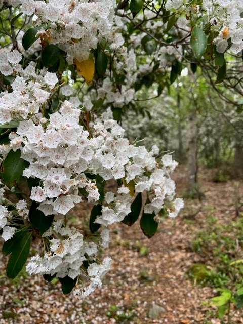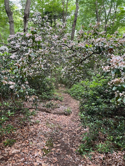 I returned again in June, this time meeting a friend at the Brockway Hawthorne parking area on Brush Hill Road. We hiked a loop of purple and white, extending our journey to include the overlook on the Ravine Trail parcel off of the yellow trail. The trails were generally well marked, although we had to pay attention a few times to stay on track. The mountain laurel was in bloom and we encountered many tantalizing fungi. We clocked almost 4 miles and a total ascent of 619’.