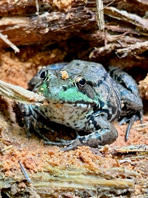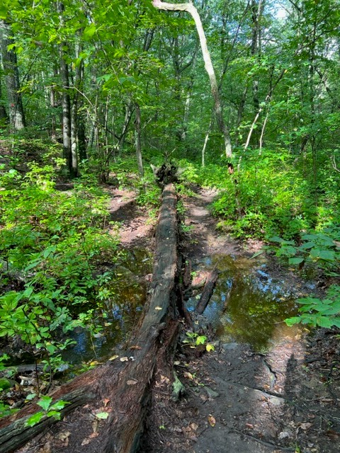 While going along the blue trail we passed a small puddle and heard a big splash. I immediately crouched down to search the water for a frog. Being a bit wobbly, I reached out my hand to steady myself by holding onto a rotted fallen log. My friend was also peering down, and her dog started to splash in the water.
