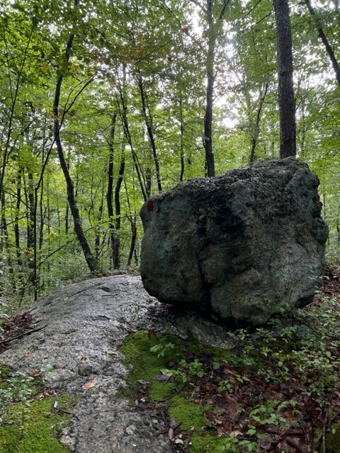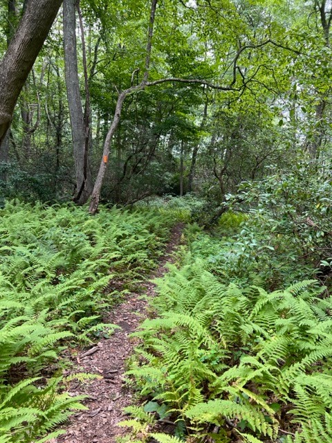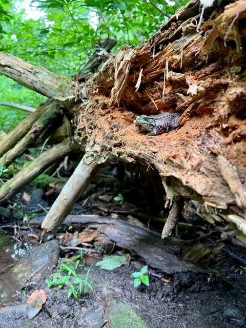 I returned once more in August to hike the Selden Creek Preserve with friends. We did the same route I had done in January, adding in the short yellow trail, which presumably doesn’t get much traffic as it was quite overgrown. We covered 2.75 miles. I enjoyed seeing this parcel in a different season. While I could still get a sense of the rolling hills and boulders, the tree cover and lush ferns gave the hike a different feel. Below I share some frog photos, but it is the STORY behind this frog that makes me laugh and illustrates the truism that sometimes you don’t see what’s right in front of you.
