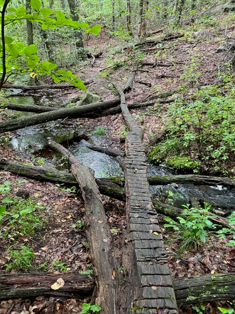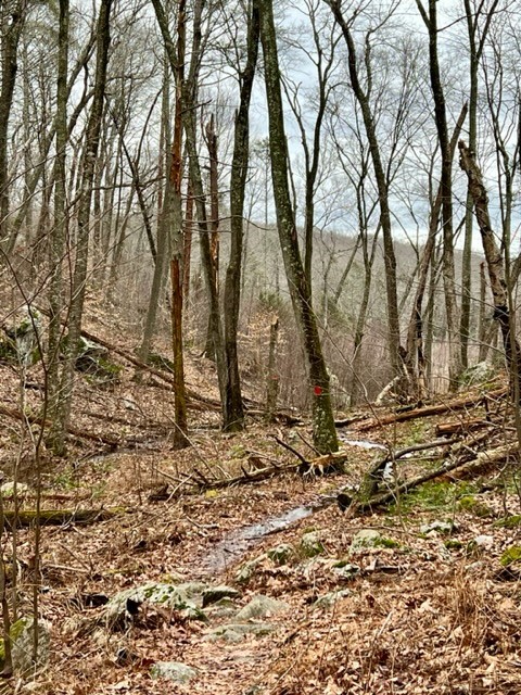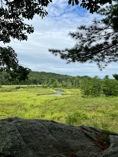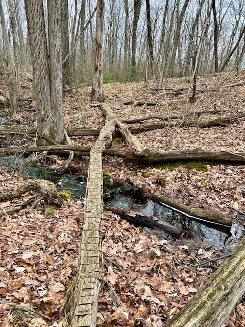 There are three adjoining preserves that make up the Hadlyme Hills: Brockway-Hawthorne Preserve, Ravine Trail and Selden Creek Preserve. I first visited on a bleak January day after a major deluge. If I had had any expectations I think they still would have been exceeded. These 3 parcels offer over 6 miles of trails on 382 acres. I started at the Ravine Trail parking pullout on Mitchell Hill Road. My route followed a 5 mile loop of the Ravine Trail and Selden Creek. If you like overlooks with scenic views this is a great destination, as there are 4 of them. My route through the Ravine Trail property was red to yellow to white. The red trail has some steep sections and creek crossings. The path through the ravine is enchanting. There are two blue spur trails that are worth the detour. The first is a very short path to a breathtaking open view to the marsh below. The second spur trail adds about a half mile to your hike and the views are of the same marsh from a different vantage point, and because of the trees I imagine the view is obscured once the leaves emerge (I confirmed this during my summer visit!) It was here where I encountered a pileated woodpecker. I had been making all kinds of noise sitting on the bench, having a sip of water and snack. I picked up my camera and approached the cliff edge, startling the bird, which had been quietly perched on the large branch of a dead tree that was leaning over the abyss. As soon as I appeared in its sight it flapped its wings and flew away. The white trail crosses Joshuatown Road and continues onto the Selden Creek property. I took the white trail to the end, then followed orange to get all the overlooks, which look out onto Selden Creek and the island of Selden Creek State Park which is only accessible by boat. I followed the blue trail back. The Selden Creek woods have a nice wide open feel with rolling hillsides and some impressive trees. Once back on the Ravine Trail side I took white to an orange crossover trail to catch the purple trail back to my car.