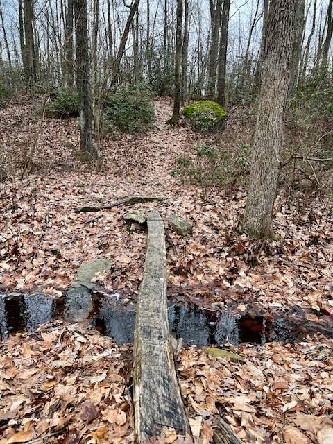 To give you a clearer image of the stream crossings you will encounter on the southern red loop, the photos below show them in winter and in summer. If this type of crossing makes you uncomfortable, you can opt for doing just the western loop, or you can do a shorter southern loop by turning at the stream crossing and taking the yellow trail back.