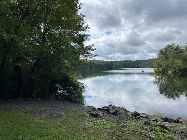 I imagine Millers Pond can get very crowded in the summer, but in the off-season it is generally quiet. The red trail covers over 9 miles, and while there are no overlooks it is a good woodlands hike. I first visited in January, and chose to break it up over 2 days. The first day I did the western loop starting north right from the parking lot. The trail takes you past some old ruins early on, and then winds through the woods. At times you are fairly close to homes. This loop has an easy stream crossing and goes along a scenic ravine. When I got close to the pond, I diverted onto the blue and white trails, returning to the parking lot along the pond’s western banks for a total of 5.5 miles. Later that week I did the southern loop totaling about 5 miles, coming back along the southeastern shore on blue/white then white. The southern loop twists and turns taking you over numerous rocky outcroppings with quartz studded rocks and sparkling mica. This route also has more challenging stream crossings. The water was flowing strong in January, and there was one place where I crossed on a notched log, so I was glad to have my poles with me. Evidence on the trails shows that this is a popular destination for mountain bikers, but I only encountered two. I returned in mid-September to see what the trail looked like still swathed in greenery, repeating the southern loop of the red trail but this time looping around the pond on the northwestern trails. With recent rains the mushrooms were fruiting everywhere, but it was also extremely buggy. Since these trails have such great rock formations, my preference is for fall to spring hiking at Millers Pond. Hunting is allowed here, so be sure to wear orange if you go during hunting season. I also recommend bringing a trail map, as there are numerous trails, including several that are not blazed.