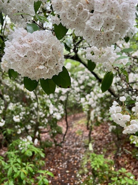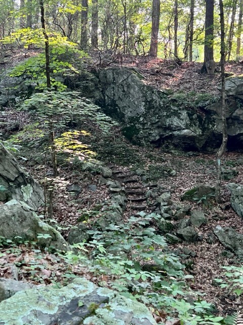 The following description assumes starting at the blue trail trailhead on Jericho Road and heading north in a counterclockwise direction. Almost immediately the trail splits. Take the blue trail to the right and go up the first of many stone steps built by the CCC. After about .3 miles you come to four concrete footings on the right — all that remains of an observation tower built by the CCC for recreational purposes. In some places this is referred to as an old fire tower, but that is incorrect. Continue north along a scenic ledge and you will encounter several more up and down sections with stone steps before crossing Jericho Road, and continuing on blue. At the end of this next section, before crossing Jericho Road a second time, you will pass a large vernal pool on your right. Hiking at this time of year it is hard to imagine this seasonal pond dries up completely in summer, but it does! The final section of blue trail is not part of the original trail, which went all the way to the Odber picnic site on Beaver Meadow Road north of Route 9. Once Route 9 was built the northernmost section of trail was rerouted to its current location. After the trail crosses Beaver Brook watch for the junction with the blue/red blazed trail on the left. The first section of the blue/red Wildwood Trail winds steeply uphill to the top of the ridge and is spectacular in June when the mountain laurel is in bloom. When you reach the ridge top and start your descent you know you are almost done.