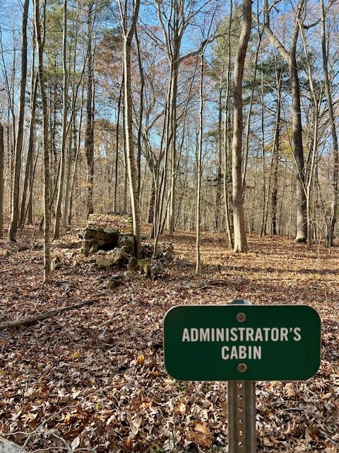 From left to right: Ruins of Administrator’s Cabin; Chimney of the Chief Forester’s Cabin; Latrine ruins; kiosk with updated Lowry Woods Trail Map