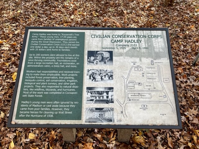 That changed recently when I did a loop hike in Madison, CT in early 2023 and passed through Camp Hadley. In 2013, high school sophomore Sam Wilson became intrigued by some overgrown ruins he spotted in the woods while out walking. This initial interest evolved into a student-led project (in cooperation with the Madison Land Conservation Trust and the Department of Energy and Environmental Protection – DEEP) to study the history of the CCC’s Camp Hadley, clear the area and create signboards and markers to explain the visible ruins. This newly redone trail was inaugurated in 2015 as the Conservation Corps Camp Hadley Trail. As I paused to read the signboards and examine the ruins, I became interested in learning more about the history of the CCC in Connecticut.
