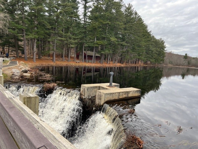Continue following the yellow blazes along the eastern side of the reservoir. You will pass a camping area with tall pine trees and lean-tos. If you go on a weekend you may encounter a Boy Scout troop or other youth group. Continue on yellow around the pond until the trail merges with red/blue. Stay left, and when the trail goes over an arched footbridge continue on blue/red as it loops around the west side of the reservoir. When you reach the southern end of the reservoir you can walk out to the beach or continue straight back to the parking area by following the blue trail. While called a reservoir, it is not a drinking water supply, so swimming is allowed. According to the DEEP “Pattaconk Reservoir probably was originally constructed to provide a summer water supply for powering mills downstream.”