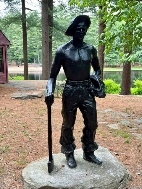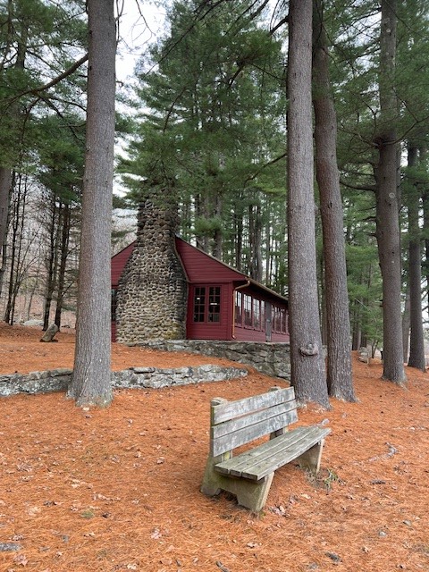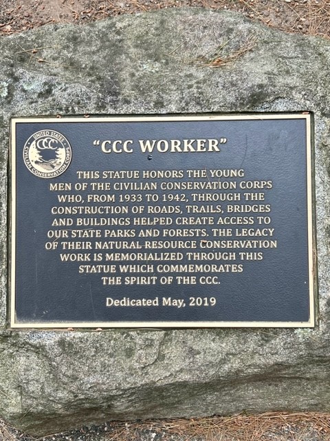 Killingworth was home to Connecticut’s first CCC camp, Camp Roosevelt, named for the President who initiated the program. Workers from Camp Roosevelt initially worked on road improvement projects at Hammonasset Beach. In 1934, the most iconic and impactful project for our area began – construction of the dam along Chatfield Hollow Brook creating the 7-acre Schreeder Pond, a popular swimming destination for state residents. Along with the dam, CCC workers constructed the Oak Lodge which was used as the Mess Hall. It is now on the National Register of Historic Places and serves as a Nature Center. I read a recent article about Naturalist Wray Williams who works at the Nature Center on the weekends (see article link in the Bibliography). The article said he hoped to stretch his hours into October, so I was pleasantly surprised when I stopped in the Sunday after Thanksgiving and had the chance to tour the interior of the lodge and talk with Williams. He wasn’t sure how far into the winter season the Lodge will be open, but if you are in the area it’s worth checking. Even if you can’t enter the Lodge, on the exterior you can view a statue honoring CCC workers that was dedicated in May of 2019. According to an article in the New Haven Register, two former CCC enrollees (aged 102 and 96 in 2019) were in attendance at the dedication ceremony. Other legacy contributions of the Camp Roosevelt workers were rebuilding the old water wheel and mill pond, and the construction of trails in the park running from Route 80 to the mill pond.