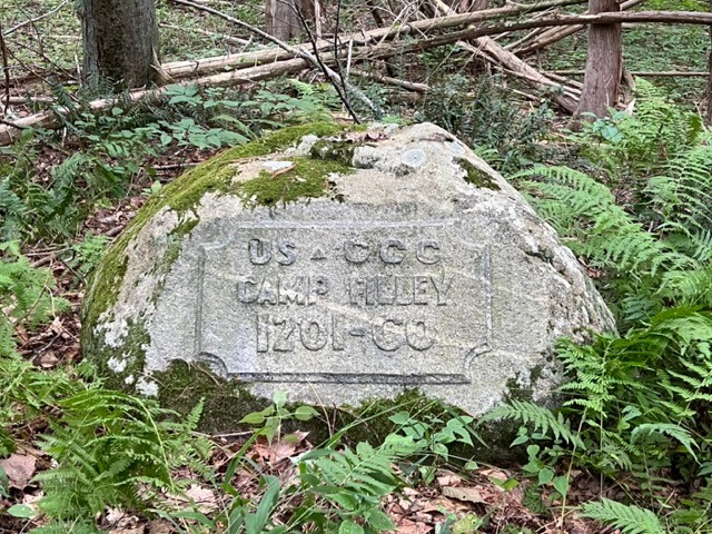 In Haddam, the CCC camp, Camp Filley, was on the corner of Filley and Turkey Hill Roads. The only remaining structure is the state-owned “Cockponset Lumber Barn” which is listed on the State Register of Historic Places. The ruins of the camp behind the barn have been designated a State archaeological preserve and access to the public is limited. Podskoch’s book includes a hand-drawn map and an aerial photo of the camp which are helpful in envisioning what the buildings used to look like. I was fortunate to get a personal tour of the old camp from my fellow Cockaponset Trail Manager and mentor, Rob Butterworth. The stone with the Camp Filley name and company number is still there, although it has been overtaken by the woods. It would be wonderful to see these ruins turned into an accessible history trail similar to the work done in Madison at Camp Hadley.
