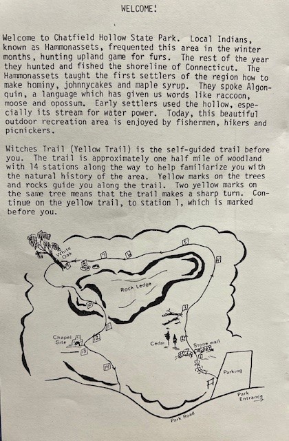 This yellow-blazed trail is one of my favorites. The trail starts on the right side of the entrance road opposite the picnic pavilion and comes out near Schreeder Pond. It is just under ½ mile, and offers a lovely route through picturesque rock formations with the added bonus of a mysterious chimney. Still visible along the trail are 14 numbered timber posts. I recalled a kiosk with maps at one point in time. In Podskoch’s book I was thrilled to see a photograph of the old kiosk and a carved wooden map showing the 14 reference points. I noticed that local resident and DEEP employee Andy Annino had provided Podskoch with information about the stone chimney which was built by the CCC and purportedly part of an open-air chapel . I contacted Andy and he was able to track down a copy of the booklet for me! I share photos of the booklet pages after the bibliography at the end of this post. I plan to hike this trail again in the near future with booklet in hand to see if I can identify all the listed features these many years later. Perhaps I will see you there!