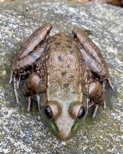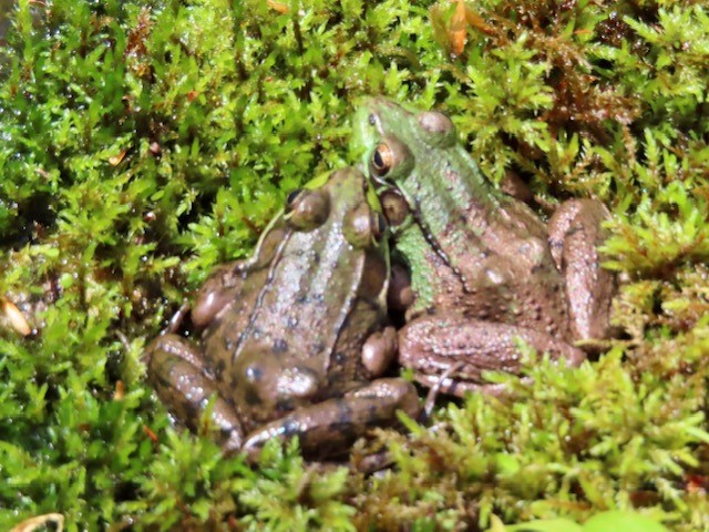 Green frogs from left to right: hiding under a leaf; a frog on a very cold April day that sat perfectly still for a photo shoot from every angle — it seemed literally frozen in place, so when we passed by later and it was gone we figured it either finally was able to move, or got eaten; my favorite frogs from Covid times — we binge-watched all 6 seasons of Downton Abbey and named these ones Mr. Carson and Mrs. Hughes.
