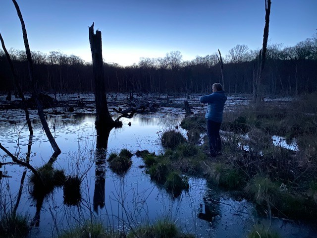 I became intrigued with frogs in February of 2018 after a FrogWatch training session to become a Citizen Scientist. A friend and I got in the habit of a weekly evening hike / frog listening session. It was a blissful way to end the day. (Photo at right — my FrogWatch listening buddy at our secret listening spot).