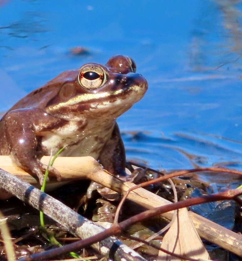 Above left: wood frog on land, its regular habitat; Above right: wood frog in aquatic environment for mating