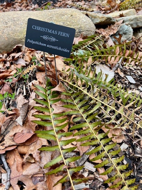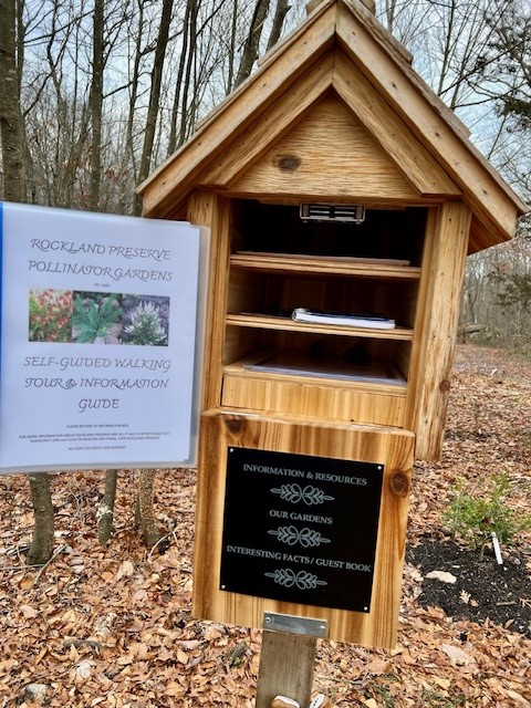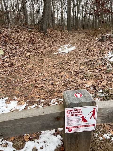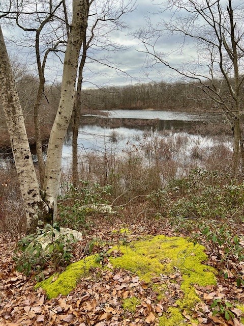 The parking for this trail is a lot at the end of the Renee’s Way cul-de-sac in North Madison (not named for me, but a girl can dream!) From the parking lot, I walked around the yellow gate at the back and followed the white trail blazes, keeping to the right to do a counter-clockwise loop of the pond. The trail winds along gently up and down with views of the pond through the bare trees from different vantage points. As I reached the northern end of the pond, I happily stumbled upon a new Pollinator Pathway garden with a plaque denoting the dedication in 2022. There were small signs marking various plants (this was mid-January, so except for the Christmas fern there was little to see plant-wise). There was a wooden box on a pole and inside were trail maps, a guest book and a binder describing the various plants present in the pathway garden and within the Rockland Preserve in general (another area I have devoted space to is the Wildflower Preserve trail within Rockland). Continuing along the path, I became confused by the presence of purple trail blazes that appeared along with the white. These had actually been present at the very start of my hike but I had ignored them. When I finished my hike, I saw that the parking lot kiosk explains that the purple blazes are the trail markers for the new Pollinator Pathway Garden. This was a good reminder to always check the kiosk, even if you are familiar with a property, as you never know when it will have new information.