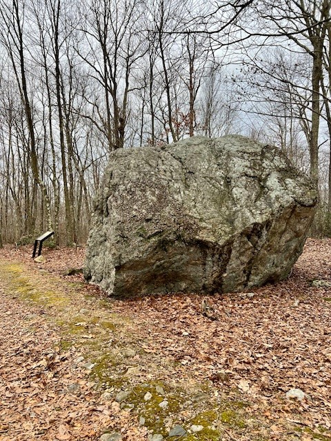 I chose to extend my hike, so after crossing the bridge by the beaver dam, instead of taking the route back to the lot I made my way over to the giant glacial erratic visible from the trail junction. From there, I continued on the path to the left of the erratic, then took a trail marked both blue and blue/red. I stayed to the right where the trail dead ends into another cart path and followed the signs to the Colliers chimney and hut remains. From there I looped back on the red trail and finished on white/purple for a total of 2.25 miles (there are two options as the red trail is also partly a loop trail.)