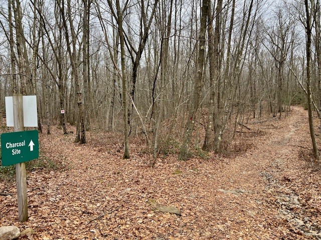 from left to right: the beaver dam along the north side of the pond; the bridge by the dam; the large glacial erratic; facing north – the two paths of the red trail loop. Both will take you to the charcoal site.