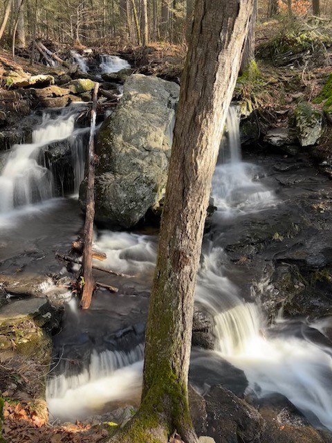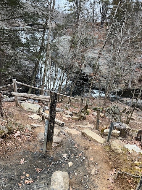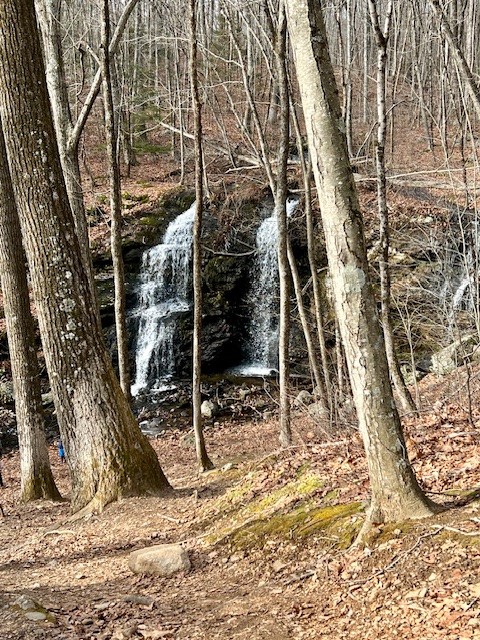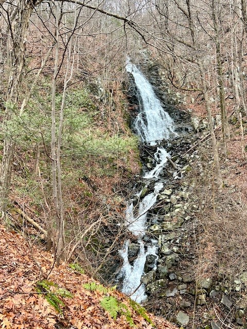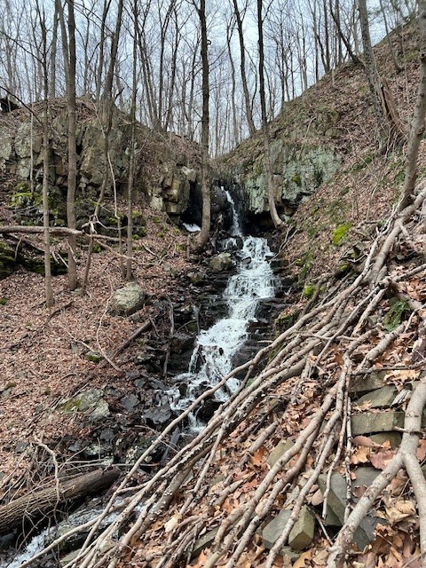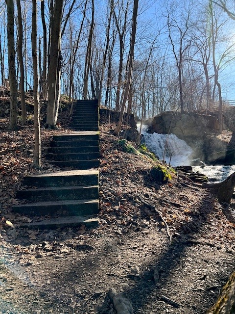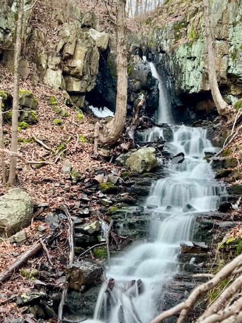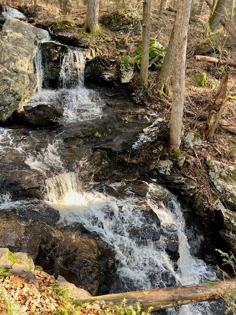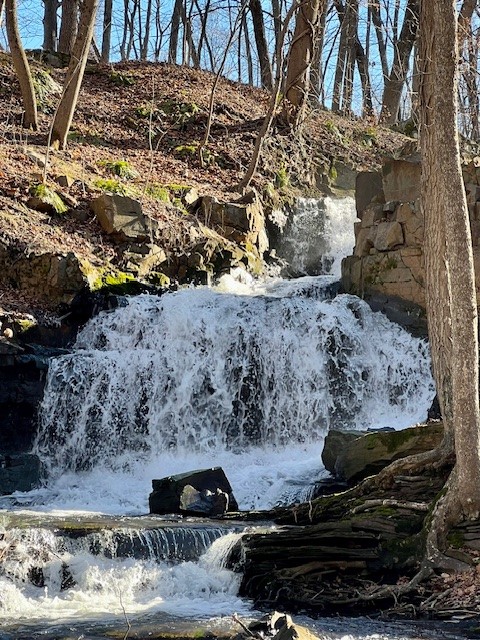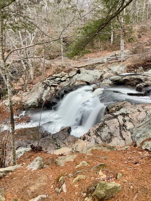 I returned in early February of 2024, and with the leaves off the trees I could see the waterfall from the parking lot. At the back of the lot there is a set of stone steps leading down to the white trail. Alternatively you can take the trails to the left or right. I took the steps and followed the path to the base of the falls. The stream was not passable, so to get to the other side I backtracked and did a clockwise loop on the white trail, starting around the Lower Pond. At one point I popped out onto the road briefly and then reentered the woods. After going around the lower pond I descended a flight of steps to admire the waterfall from the base of the falls on the opposite bank. Taking photos was tricky in mid-afternoon with the low southern sun in the background. At the top of the falls there is a dam that creates the Upper Pond. There is a path to cross here, but the water was quite high and I didn’t want to chance getting my feet wet. I chose to do a clockwise loop of the Upper Pond and wetlands. The eastern bank of the Upper Pond is a single track that undulates gently up and down through the woods. The pond becomes swamp, then boggy wetlands. To extend your hike you can keep going straight on the white trail to intersect with a yellow trail loop. I chose to take the white trail in a loop to the right where there is a footbridge. There is one muddy section where there are stacked up small logs to help with the crossing. The trail back on the western bank is a wider dirt road. I recorded 1.5 miles with 147’ of ascent.