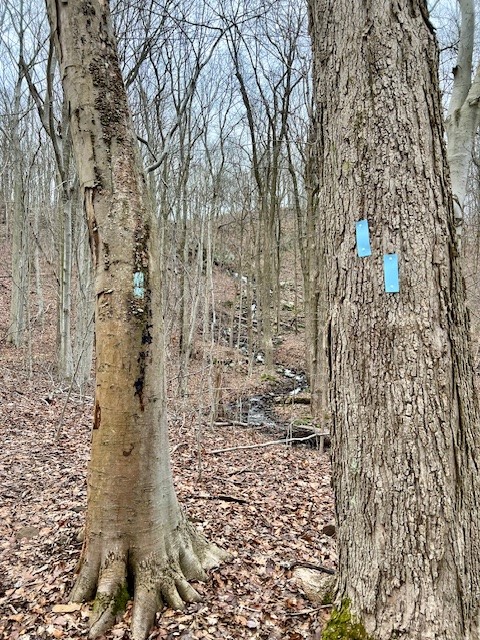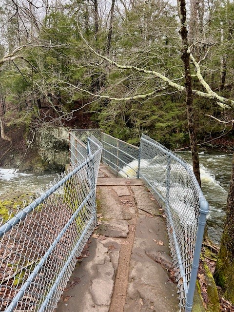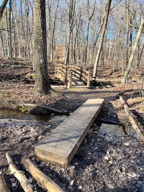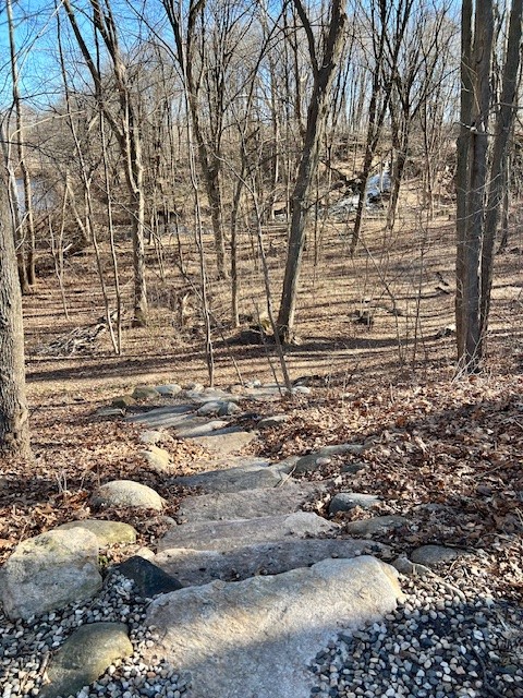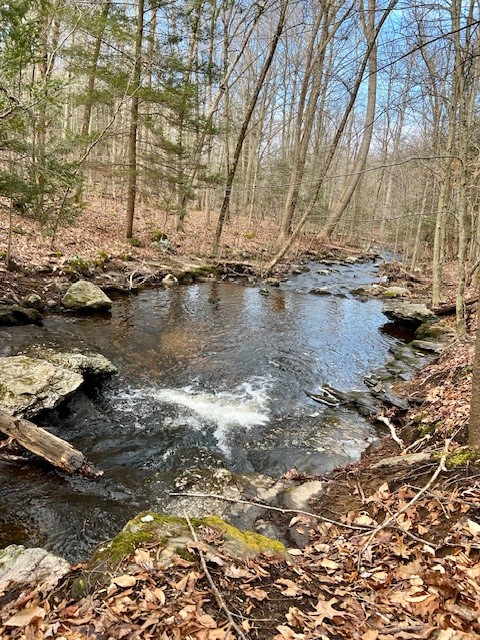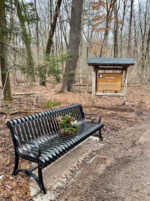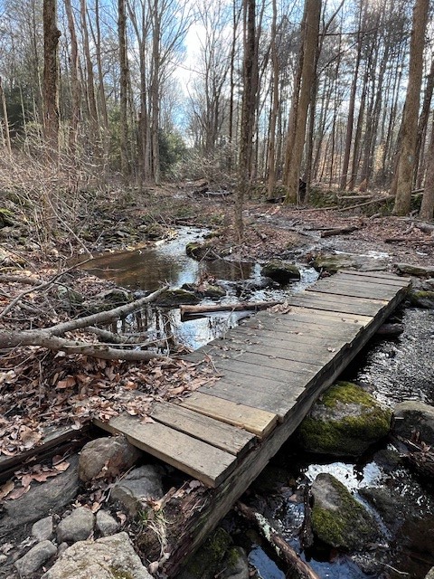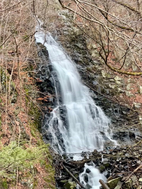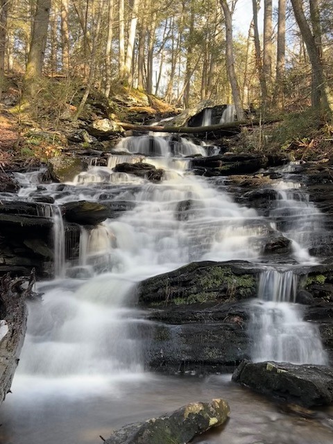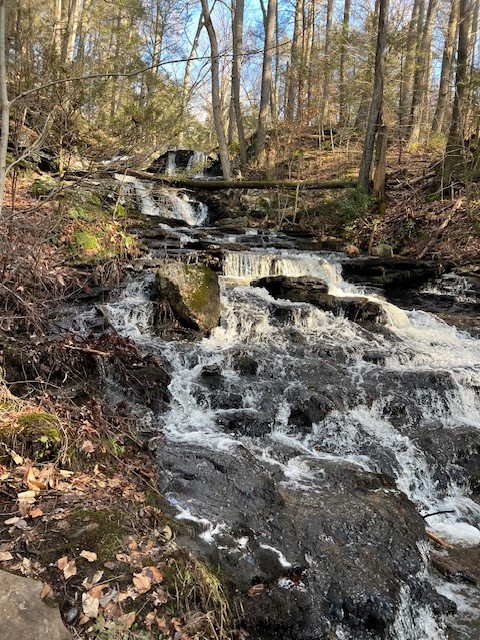 I returned in early February of 2024, and with the leaves off the trees I could see the waterfall from the parking lot. At the back of the lot there is a set of stone steps leading down to the white trail. Alternatively you can take the trails to the left or right. I took the steps and followed the path to the base of the falls. The stream was not passable, so to get to the other side I backtracked and did a clockwise loop on the white trail, starting around the Lower Pond. At one point I popped out onto the road briefly and then reentered the woods. After going around the lower pond I descended a flight of steps to admire the waterfall from the base of the falls on the opposite bank. Taking photos was tricky in mid-afternoon with the low southern sun in the background. At the top of the falls there is a dam that creates the Upper Pond. There is a path to cross here, but the water was quite high and I didn’t want to chance getting my feet wet. I chose to do a clockwise loop of the Upper Pond and wetlands. The eastern bank of the Upper Pond is a single track that undulates gently up and down through the woods. The pond becomes swamp, then boggy wetlands. To extend your hike you can keep going straight on the white trail to intersect with a yellow trail loop. I chose to take the white trail in a loop to the right where there is a footbridge. There is one muddy section where there are stacked up small logs to help with the crossing. The trail back on the western bank is a wider dirt road. I recorded 1.5 miles with 147’ of ascent.