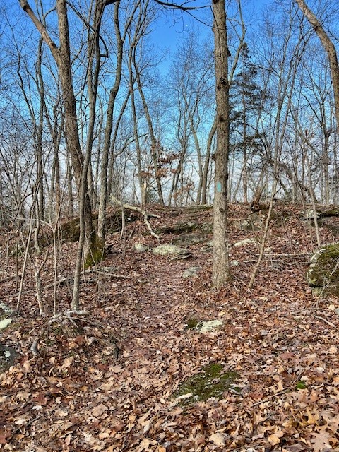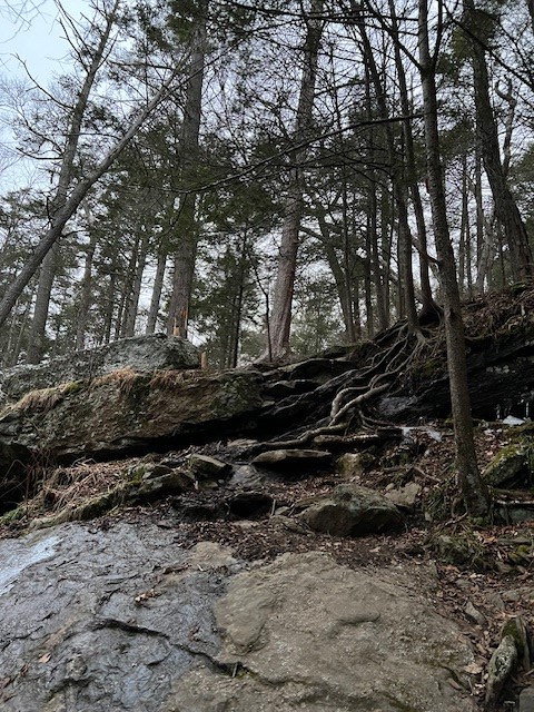 This is one of the more challenging waterfall hikes, even if you are just visiting the falls, which is an out-and-back of approximately one mile. I did a longer hike, recording 6.3 miles out-and-back to Bluff Head in Guilford with 1,007’ of ascent. Start at the trailhead on the southern end of Stage Coach Road off Route 17. On Google Maps there is a hiking pin labeled “Bluff Head from New Haven Road” where there is a pullout with room for a few cars by the trailhead. This is a section of both the blue-blazed Mattabesett Trail and the NET (New England Trail). I used AllTrails as a helpful navigation tool because it shows the location of the falls on the map. The hike is called “Bluff Head from New Haven Road via Mattabesett Trail” and you can find the link HERE. I convinced a friend to join me and we headed out on a wet morning in late January. The first section of trail is not particularly scenic. There is a lot of mud and water run-off along the trail as it ascends a fairly steep slope. We came to Stair Brook at about the .4 mile mark. While you can get a glimpse of the waterfall through the bare trees, to get the best view you need to bushwhack up the steep talus slope on the far bank. To do this we crossed the stream at the bottom – use caution and good judgment as conditions will vary. Talus is loose, angular rock that accumulates over time at the base of steep rock slopes, so you will be encountering loose rock. In combination with slippery leaves this is difficult and potentially dangerous so only explore this section if you feel comfortable in this terrain. It was only later that evening that I confessed to my friend that the author of the waterfall book wrote that this section is “very difficult” and “not recommended”. I assured her he probably wrote that for liability reasons. So let me be perfectly clear – I do not recommend climbing the talus slope!