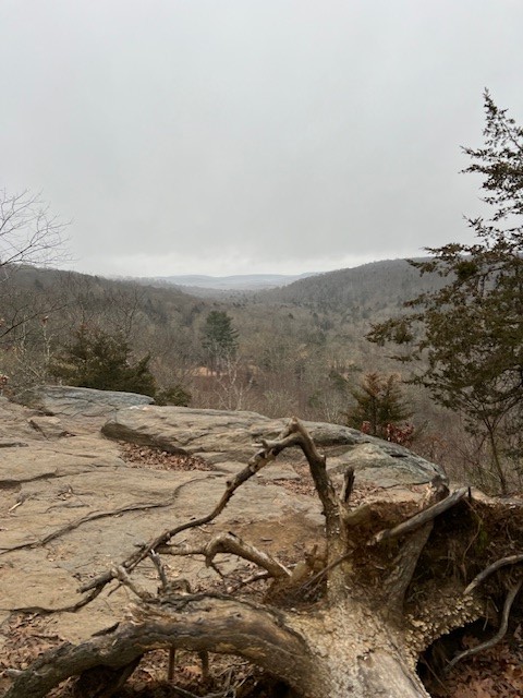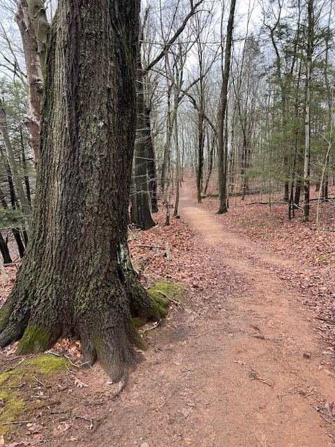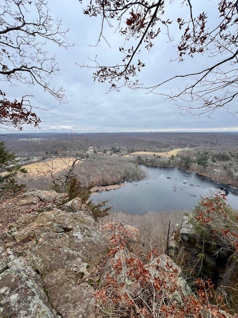 There are so many trail options at Devil’s Hopyard. I was there early on a mid-February morning and decided to try a new trail for me — the orange loop on the far side of the river. Going past the falls into the picnic area, I crossed the stream at the covered bridge and got on the orange trail. Approaching the fork in the trail I saw an animal streak by in the distance. It was too low to be a deer and too large to be a fox. As I continued I saw movement out the of corner of my eye, and closer in front of me a second animal streaked across the trail – heading from the river up into the hills. This time I was close enough to see that it was an enormous and healthy looking coyote. While I had already planned to start alongside the river and come back over the hill, this cemented the plan in my mind. This loop is a short but challenging hike with some rock scrambles and steep inclines. It passes a feature called the Devil’s Oven which is a short spur trail up to the cliffs where there is a cave. I took this trail, but stopped well shy of entering the cave. Having seen those coyotes, and knowing it was the start of coyote denning season, I felt safer not approaching the caves. At the far end of the loop at the top of the ridge there is another spur trail to a lovely vista, although on this particular morning everything was a dull gray. I recorded the loop, including the exploration of the falls, at 2.5 miles with 585’ of ascent.