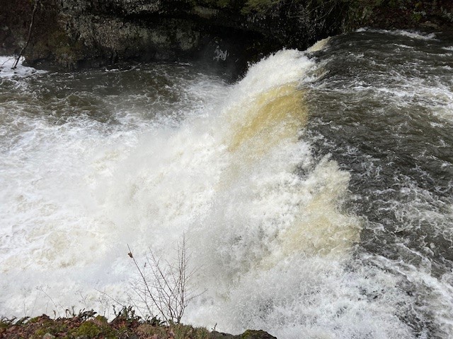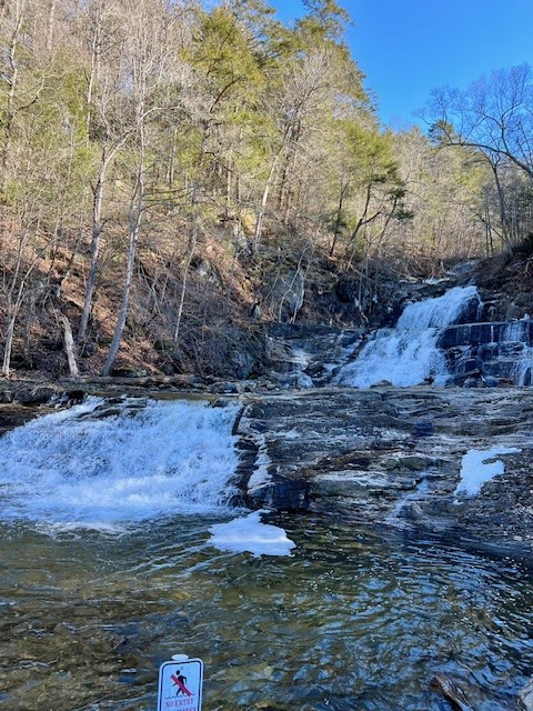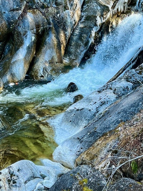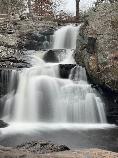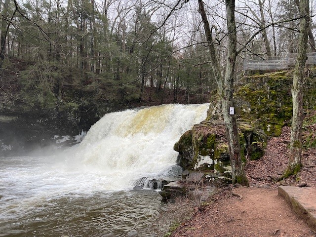 While I enjoy a pretty waterfall, especially one with a pool to swim in on a sweltering summer day, I have never considered myself a “waterfall chaser”. But after deciding to highlight waterfalls in my March Trail Talk that may no longer be true. It all started innocently enough, as most things do. It was a sparkling blue sky day in early January and I decided to kick off 2024 by visiting some State Parks on the east side of the Connecticut River that were new to me. After some deliberation, I settled on Day Pond State Park in Colchester to start. I downloaded both the DEEP Park Map and the AllTrails link for a suggested hike and decided on the Salmon River Trail Loop from Day Pond. It wasn’t until I was hiking that I noticed a short spur trail to a waterfall (photo at left). I was so enthralled with this cascade I scrambled up and down the bank taking pictures and laughing.