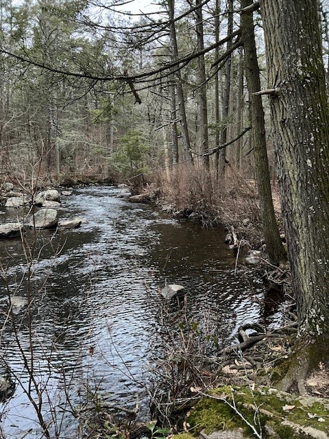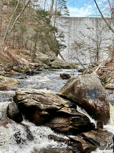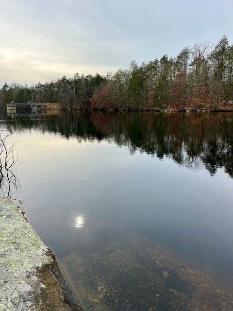 I discovered these falls for the first time in 2020 when I hiked a 7.5 mile loop of the Hammonasset Reservoir, but it wasn’t until I returned last month with my husband, Tom, that I discovered some new information. To hike the trails, you are supposed to have a permit from the Regional Water Authority. You can purchase a permit at the RWA website HERE. The Killingworth Library has an RWA permit available to borrow. For falls access without incorporating a hike, the Connecticut Waterfalls guidebook describes a set of stone steps that descend to the falls at the northwestern end if the bridge on Route 80 separating Madison and Killingworth. There are a few pullouts for parking along this busy two lane highway. As a permit holder, we opted to park in the gated lot on Route 80 and do a modest hike looping in on the green-blazed Hemlock Trail, continuing on white to the falls, then back on white. I recorded 1.6 miles and 207’ of ascent. The green trail goes along the banks of a peninsula that juts into the reservoir and has some tranquil views of the water and nearby islands.