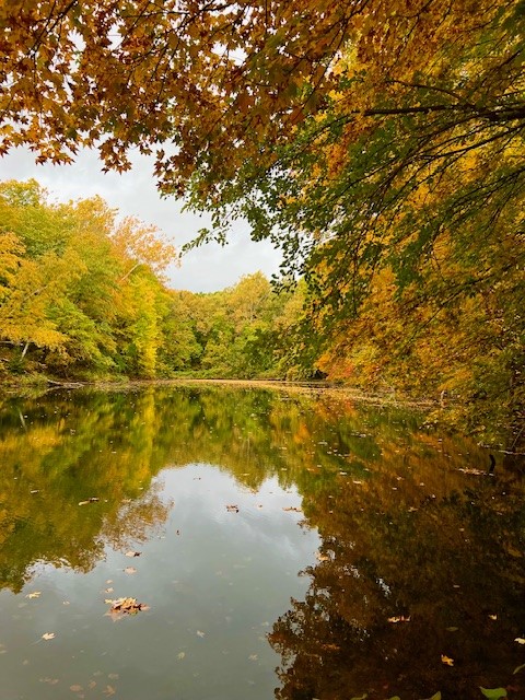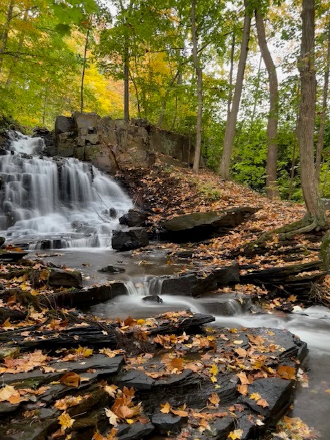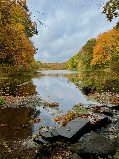 I first discovered the Dividend Pond Trails and Archaeological District when I was researching Connecticut’s glacial history. This area was the southern terminus of glacial Lake Hitchcock, which at one point extended all the way north to St. Johnsbury, Vermont. During the area’s more recent history, much industry developed around Dividend Brook, which flows into the Connecticut River. One of those industries, Bigelow-Sanford Inc, sold a 68 acre parcel to the town of Rocky Hill in 1973 for one dollar and tax relief. In 2006 the property was declared a State Archeological Preserve and after much work the Dividend Pond Trails and Archaeological District held its grand opening in 2012. There are 3 miles of trails and 10 signposted archaeological sites dating from 1667 to the 1900’s. The parcel includes 4 dams and two mill ponds. The dam at the base of the upper pond features a scenic waterfall where it flows into the lower pond. This is a gem of a spot in the middle of the Rocky Hill Industrial Park. The first time I visited was in mid-October of 2022. It is a very scenic spot when the leaves are changing color.