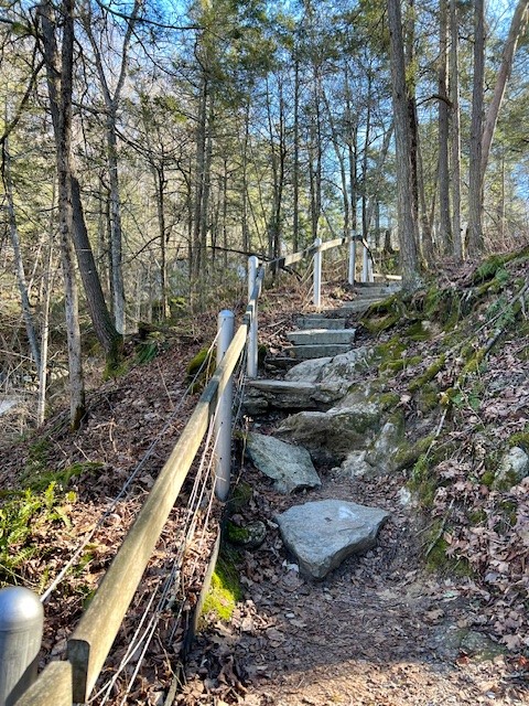 I chose to do a longer hike, recording .85 miles with 237’ of ascent. By the base of the falls, I climbed the stairs that are built into the right side bank. Along the way there are several wooden deck viewing points where you can admire the numerous cascades. Perhaps the most dramatic one is at the top. The rock formations and potholes are amazing. At the top, the trail comes out on a road. I followed the road across the stream and took the red blazed trail immediately on the left. I followed this back to the parking lot. According to the map you can extend your hike by taking the yellow trail which veers off from red and reconnects further down. The map describes it as .67 miles and my guess is that is offers a gentler grade down. The red trail passes a very impressive stone wall and at times is quite steep. I had to climb over several downed trees and pick my way through some muddy sections. At the bottom where the trail opens onto a grass strip by the parking lot I was unable to get through without getting my boots quite wet. You won’t find much solitude here, especially on weekends, but the falls are spectacular and I had fun talking with other visitors, including one who reminisced about the days when he could scamper up the rocks and swim in all the holes. There are bathroom facilities seasonally, a compost toilet year round, and several picnic tables in the field between the parking lot and the falls. For a trail map click HERE