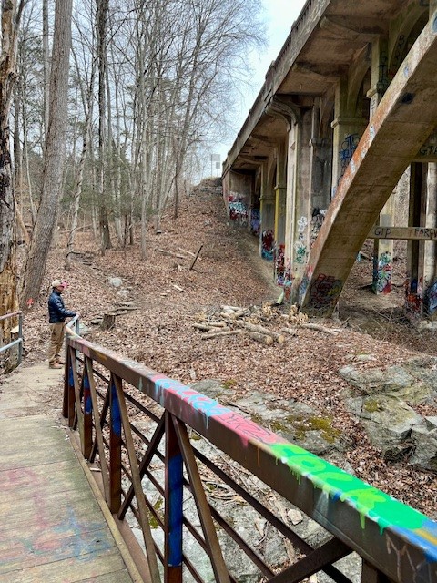 Numerous legends abound about various ghosts that haunt the falls which I won’t relate here. See the bibliography below for a link to an article that lists several. The approach to the falls feels otherworldly. The Hammonasset River flows over an immense dam, then rushes into a gorge, passing underneath a footbridge and a wide arched bridge that carries vehicular traffic along Route 80. Both bridges are covered in colorful graffiti (be forewarned that some is “R” rated) that gives the scene a dystopian effect. I ran ahead, taking in the sights and sounds of rushing water, framing photos and videos of the falls. Looking back, I saw Tom had stopped at the far end of the footbridge and was gazing up at the big bridge. Hello!! The falls are over here! Why was he not as excited as I was?