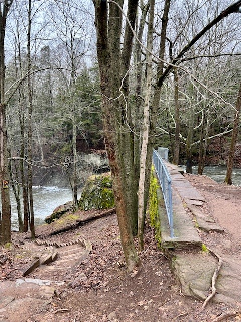 The steps from the parking lot with falls in distance; The falls from the left bank; the steps down on the right bank; logs and footbridges to cross the mucky sections
