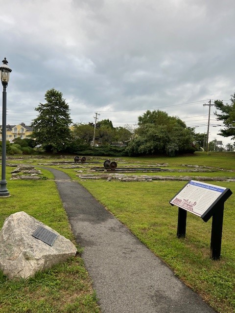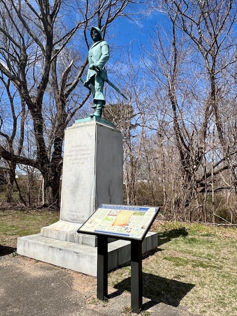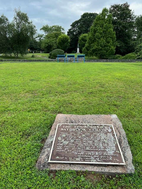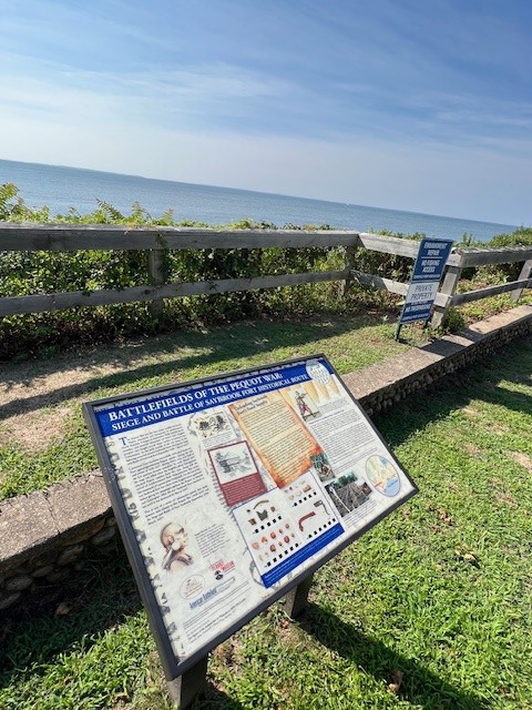 In August of 2023 I enlisted a friend to join me on this long walk. Parking at Fort Saybrook Monument Park we did the loop in a counter-clockwise direction, first stopping at the cemetery gate to read the signs but otherwise not touring the cemetery. From there we crossed to the north side of College Street and headed west. This becomes Main Street (Rt. 154). Although not listed in the pamphlet – don’t miss the round stones and plaque in the front yard of 530 Main Street. These are the only remaining relics of a windmill built by Lion Gardiner in 1636-37 which stood on that site for 175 years. Farther along, near 500 Main Street, look for the signboard that details the events of February 22, 1637 at Saybrook Neck, where a group of Pequot warriors ambushed Gardiner and some of his men as they were cutting reeds. From here, take a left onto Maple Avenue. As Maple Avenue turns the corner, take Hartland Drive on your right and follow it to Cornfield Point. This point got its name from the acres of corn that were planted there to supply the fort. Why the fields were planted so far from the fort is lost to history, but the pamphlet suggests that the land had previously been “cleared by the Western Niantic Indians who lived in the area and recently sold their land to John Winthrop, Jr. and Saybrook Colony”. There is a signboard with information and several benches at the scenic overlook where you can rest and admire the view. From Cornfield Point head back to Maple Avenue via Sea Lane and turn right, walking along the waterfront. We did not locate a signboard for Guardhouse Point – but the old guardhouse was generally in the area of the Knollwood Beach sign and its significance is described in the pamphlet. Continuing along, Maple Avenue becomes Bridge Street as you near the causeway. Stop at the causeway to read about South Cove and try to envision the English soldiers crossing the cove in canoes to get to their cornfields before there was a bridge connecting the points of land. From there continue on Bridge Street until you reach College Street, then turn left and head back to Fort Saybrook Monument Park. From here you can do the Fort Siege Route or, like we did, save that for another day. (SIDE NOTE: It was on this walk just before reaching the causeway that I discovered the trailhead to the Fenwick Grove Trail featured in my January 2024 Sunrise Adventures blog post. You can add this wooded loop trail to your walk for an additional .7 miles).