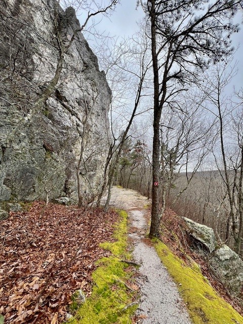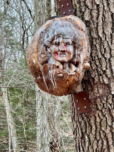 from left to right: A carving attached to a tree to left of trail; pine trees; a typical ledge section; overlook facing to the east