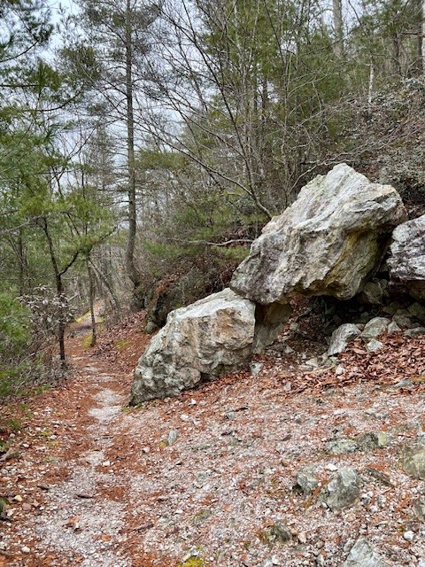 from left to right: another challenging trail section; one of many glacial boulders dotting the landscape; some sections of trail were easier to navigate; Dedication boulder