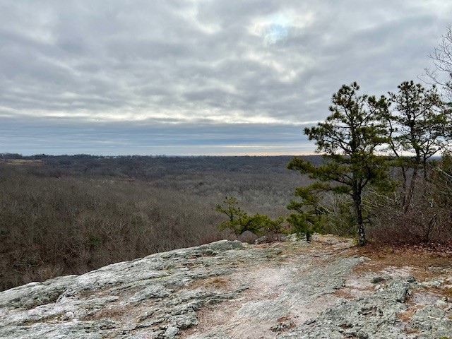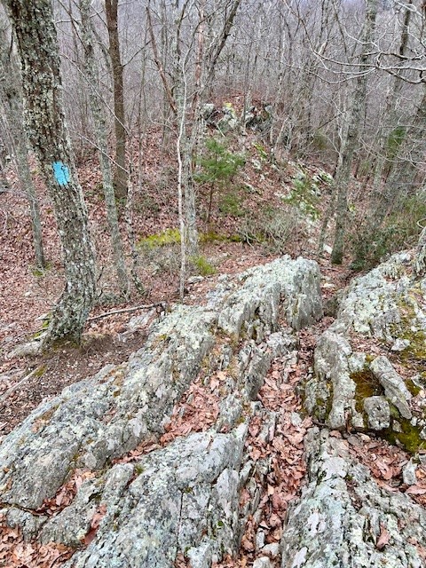 Coming down there are some challenging boulder scrambles. After a short descent, instead of continuing on blue, take the well-worn unmarked trail that goes straight. After a short distance there is a spur trail that leads to the best view overlooking Lantern Hill Pond. Retrace your steps and continue on the unmarked trail until you come to a T intersection. Turn right. This trail was originally marked with the red arrow blazes of the Foxwoods Resort, but many of the blazes are no longer visible. Cut into the side of the steep quartz hill, this trail goes along the cliff face. It eventually meets the blue trail and descends to the parking area. The parking is a wide pullout along the road with room for several cars. While there are no facilities, the Boy Scouts provide a single trash receptacle at the trailhead. I used this AllTrails map as a guide. This map does not consistently follow blue. I stuck to the blue trail which I believe is probably more scenic.