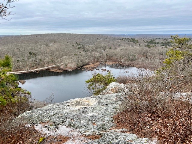 Lantern Hill marks the southwest terminus of the blue-blazed Narragansett Trail maintained by the Connecticut Forest & Park Association. I chose a short loop trail which combined the blue trail with a trail built and maintained by the Mashuntucket Pequot Tribal Nation. The first part of the trail is a rocky road bed that can be quite muddy. Hikers have worn a trail on the left side bank that is drier. I took this on the way down and noticed what seemed to be a shrine of sorts with a face seemingly carved out of a burl that I missed on the way up. At the first junction I stayed left and followed the blue trail. At this point the trail becomes much more interesting as you make your way up the rocky outcroppings. There are many pretty scrub pines and several places where you can get a good view of Lantern Hill Pond and the Foxwoods Casino below. As you near the top there is a ledge on the left with a magnificent view to the east.