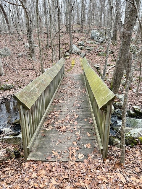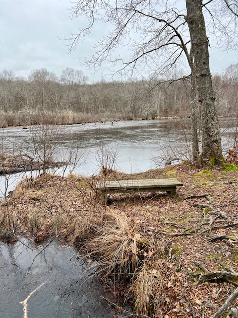 I had one additional stop in mind before heading home – a short woods walk nearby in a place called Wintergreen Woods. Although this spot has nothing to do with the Pequot War, I offer it up as a brief nature respite to round out the day. We parked in the lot at the end of Folly Brook Boulevard. This is also a parking spot for the Heritage Bikeway Path. From the parking area the entrance to the walking path is at the woods to the left. There is a loop that winds its way past numerous vernal pools with several boardwalks over the muddiest sections. There is also a small pond with a new bridge that was a CCSU (Central Connecticut State University) Civil Engineering Project. The topography that allowed the vernal pools was interesting. I did some research later and learned that these depressions were formed during the last glacial period. For a complete history of Wintergreen Woods click HERE.