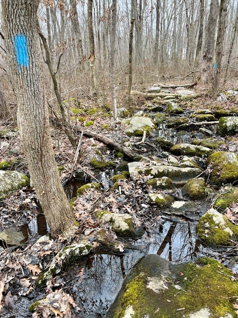 When it finally loops around you will briefly pop out onto the edge of a home’s backyard. Once you do this, look left and you will see where the trail reenters the woods. At this point the topography is a glacial jumble which adds some nice variety to the hike. There is a yellow loop you can take. While I followed the yellow blazes, they brought me back to the blue trail sooner than I expected, so I am wondering if the yellow trail has more than one branch. The rest of the blue trail gets easier to follow, more like the woods road at the beginning. There is also red trail cutover to create a shorter hike that avoids the worst of the rock-hopping. There is a trail map posted at the trailhead, but I could not find it online. For an idea of the trails without showing the blaze colors, see this AllTrails map.