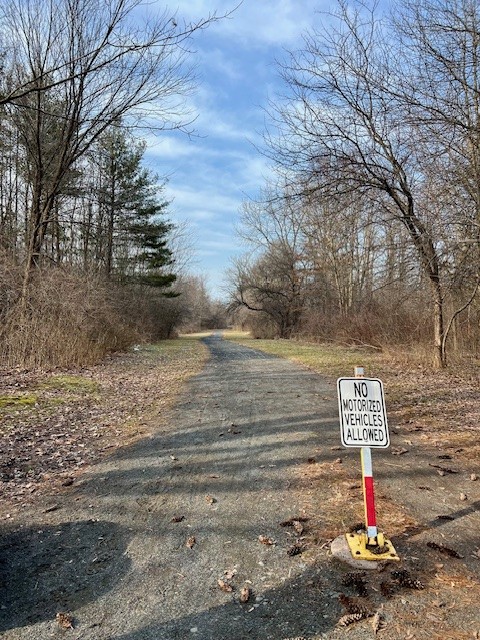 from left to right: The Bike Path; the walking path is through a flat woodlands pockmarked by vernal pool depressions; a section of boardwalk; new bridge over Folly Brook by the pond