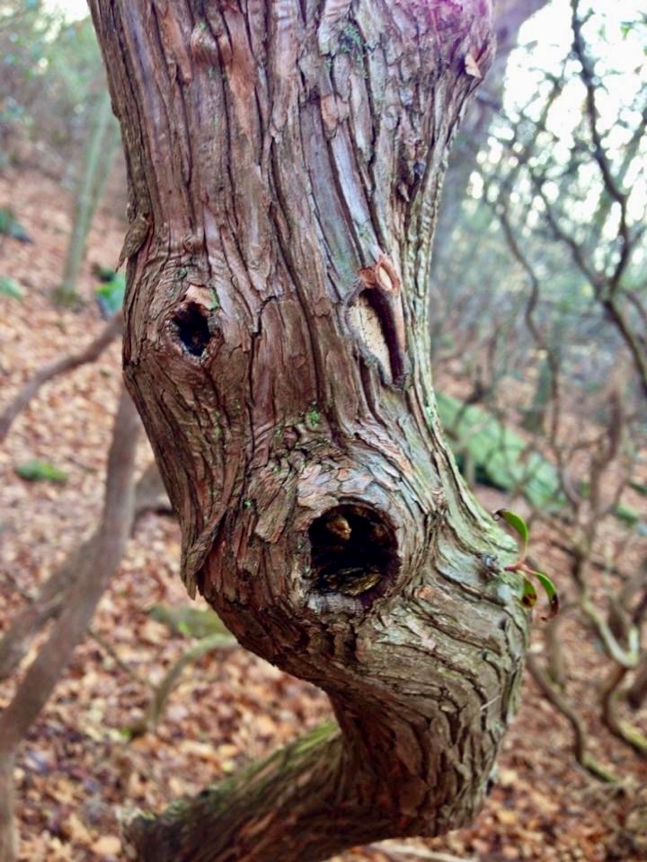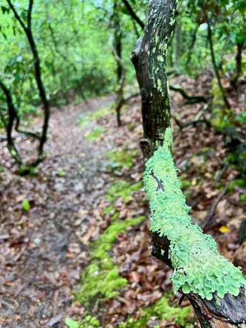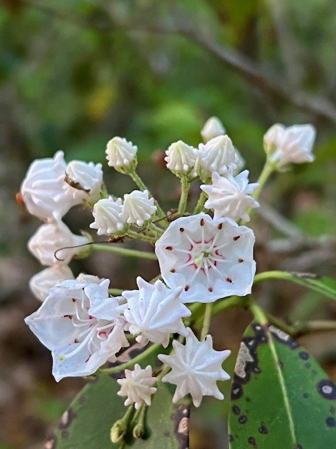 2023 was a banner year for mountain laurel. There is a dearth of information as to what makes some years better than others, but since the buds form the previous autumn it seems to come down to a combination of winter stresses and moisture. The bark of mountain laurel is a dark reddish-brown and as it ages it gets flaky and can become gnarly in appearance. The knots and blemishes can enliven the imagination. There was one laurel that looked so much like a face I started calling it “Hardy”. I would look for Hardy every time I took that trail, even introducing hiking friends to him. Alas, Hardy was taken down during some trail re-working. I particularly enjoy a mountain laurel walk after a rainstorm, as the lichen that affixes itself to the bark turns a vibrant green when wet.