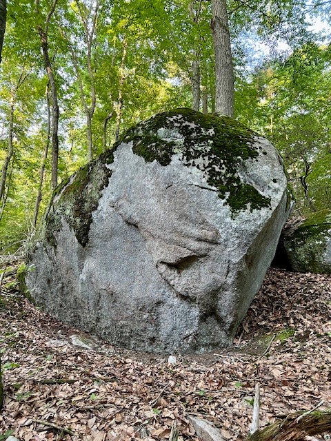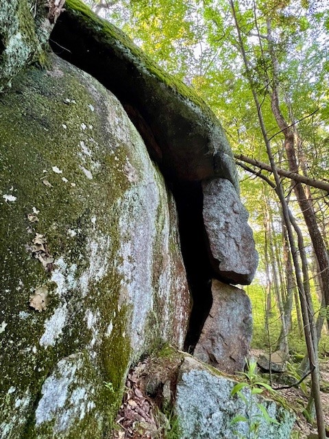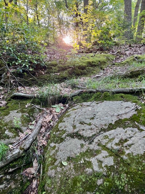 After crossing the river the trail winds through the old Denison Farm. There is a sign dating the farm to circa 1800.  The stone walls that criss-cross the property are spectacular and aroused my curiosity. An article in the OLLT’s 2017 publication, Tributaries, posits that one of the farm uses was likely raising sheep, and that “Denison built an intricate network of pens and stone walls which surely required many years and much hard work to complete.” I was equally intrigued by a photo I saw in the book entitled Images of America: Old Lyme, Lyme and Hadlyme, by Kathryn Burton. The caption read: “This Native American mortar stands on the front lawn of the [Phoebe Griffin Noyes] library. It was used by the Nehantic Indians as a corn mill. The historic artifact was found on the Dennison [sic] Farm, on Four Mile River Road….it was brought to the library c. 1898 on a stone-drag drawn by oxen.” I thought it plausible that the stone walls were a blend of Native American and colonial work. I had the opportunity to return with Edie Twining, OLLT Trustee and Chief Steward. We looked at several interesting rock formations, including a series of cairns that prompted consideration of various origin stories.  No matter the exact origins, the stoneworks are magnificent and worthy of our respect. After passing through the old farm land the trail reenters the woods and parallels a scenic ravine. The trail eventually crosses the Three Mile River again on a small footbridge, then starts winding uphill along a series of switchbacks until it levels out on a high plateau and ridge section before re-connecting with the trail that leads back to the road.