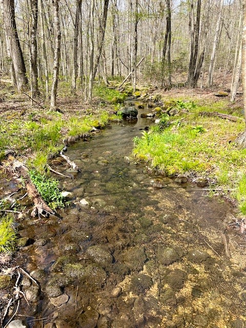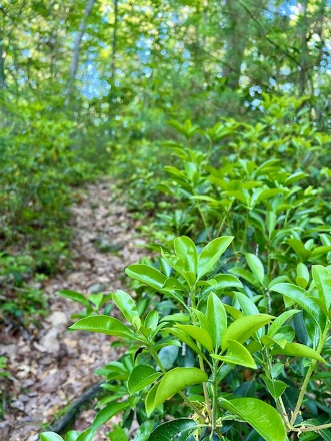 Like the dog in the movie UP whose head snaps around at the sight of a squirrel, my head snaps around at the sight of a trailhead. This happened to me in 2021 driving up Four Mile River Road every week on my way to Eastern Connecticut Ballet. I finally checked the map and learned the trailhead was for the Upper Three Mile River Preserve (UTMRP). The seeds for growing this 157 acre preserve were sown in 2004 with the purchase of a 16 acre land-locked parcel. Kudos to the Old Lyme Land Trust (OLLT) for believing in Member Mike Kiernan’s vision for a property that would be like the “Grand Canyon of Old Lyme”. In subsequent years additional contiguous parcels were acquired, but it was the 2014 purchase of a parcel with significant frontage on Four Mile River Road that allowed the vision to come to fruition with the completion of a loop trail that officially opened in 2017. The entrance to the UTMRP is on the western side of Four Mile River Road (Exit 71 off I-95) just north of the highway. There is a pullout for parking that accommodates several cars, or you can park in the commuter lot nearby. The white trail starts with a meander through a boulder-strewn woodlands and skirts a marsh where you can get seasonal views. The trail crosses two small brooks that feed the marsh. At the second brook there is a contemplation bench built by a local Boy Scout troop and hauled in last year. At the trail split I chose to go counter-clockwise, setting off to the right. While I had already passed several mountain laurels, it was at this trail split where the canopy closed in and I found myself in what I imagined would be a laurel fairyland when they are in bloom. After a short distance, a green cutover trail comes in on the left. According to AllTrails, the white-green-white loop is 1.4 miles and is an option if you are only going for the laurel. I recommend doing the full loop so you don’t miss some of the best features of this preserve. Continuing on white, the trail traverses a parcel of private property.  This section is blazed with both white and red markers, and the OLLT asks hikers to please stay on the trail.  The trail winds around an impressive glacial erratic that maintains a precarious perch. The laurels continue for a good half mile before you eventually reach the first Three Mile River crossing.