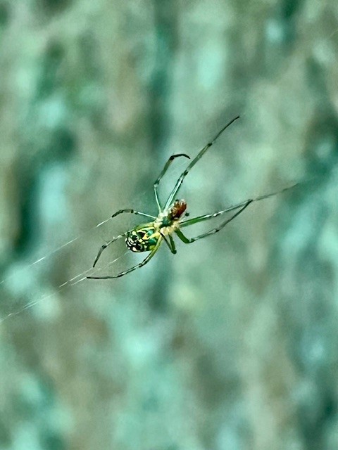 from left to right: boulder along the Blue Circle Trail; the “rock fissure for the adventurous”; the Great Hemlock stump; an orb weaver spider building its web across the Green Circle Trail