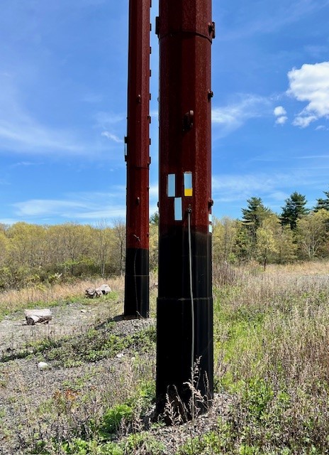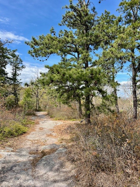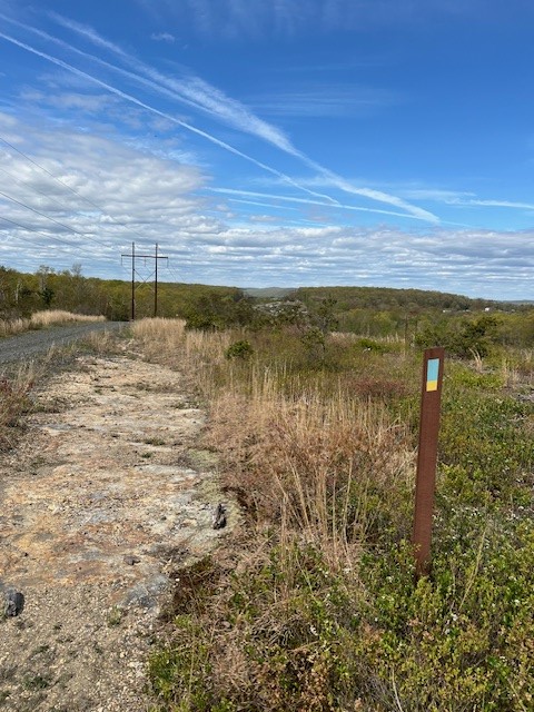 At the first intersection with the yellow/blue trail I continued straight on blue to go as far as the summit of Bear Hill.  Don’t be fooled by the USGS survey marker with an arrow on it embedded in a rock on the trail. This marker merely points to the actual summit, which is a second USGS survey marker at a lookout just off the trail.  From here, I chose to backtrack and take an obvious but unmarked trail to the right that connects with the blue/yellow trail. A few orange survey tape strands along the trail helped mark the way. I used AllTrails to find this route.  When I reached the blue/yellow trail I turned left. This is a very nice section of pitch pine with seasonal views. When I reached the 4-way intersection with the blue trail I stayed on blue/yellow which follows a cart path back to the power line corridor.  I was surprised at how muddy the trail was despite the recent spate of dry weather. I was able to pick my way through without an issue, but it would not be fun in wet conditions. The trail system here is extensive and you can plan a much longer hike, taking the Mattabesett Trail either further south toward Aircraft Road, or north to the Asylum Reservoirs. There is a map on page 19 of the Trail Guide linked above.