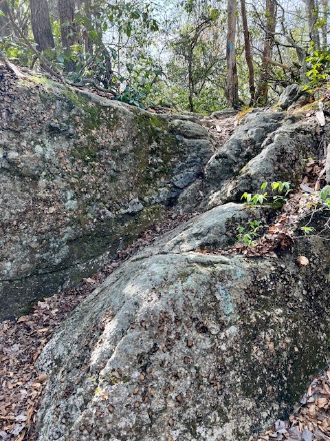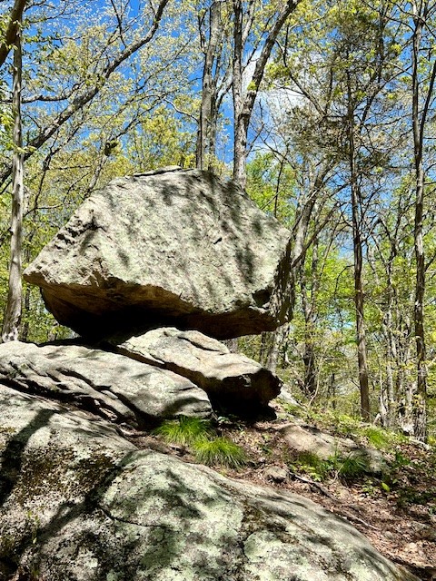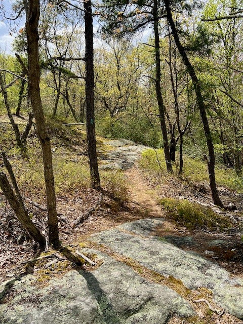 The balanced rock off the red trail; a stone border along the blue trail; the grassy section of blue trail — watch out for poison ivy