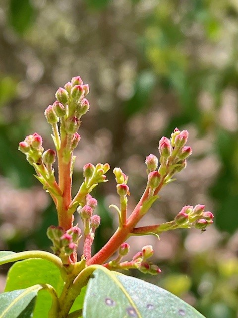 from left to right: early buds; flowers forming but not yet opened; my laurel friend “Hardy”; Partridge Berry blooms