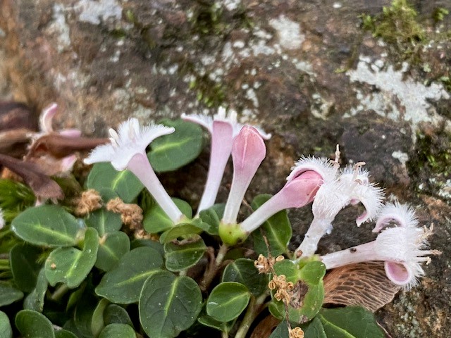 While you’re out there, look for blooming Partridge Berry (Mitchella repens), an evergreen trailing vine whose red berries are less popular with birds and animals so tend to be visible all winter. These delicate, tubular white flowers understandably get overshadowed by the showier mountain laurel.