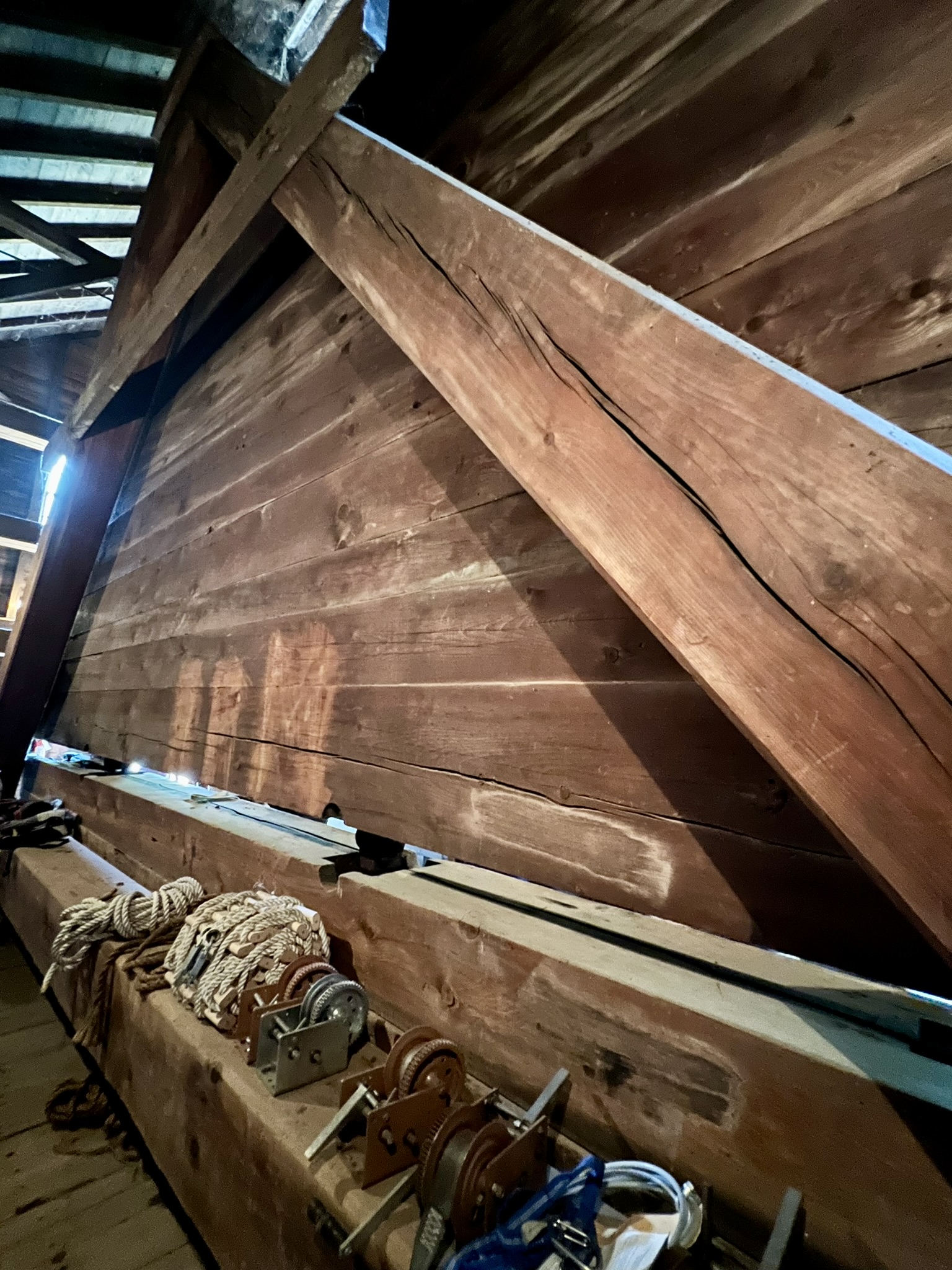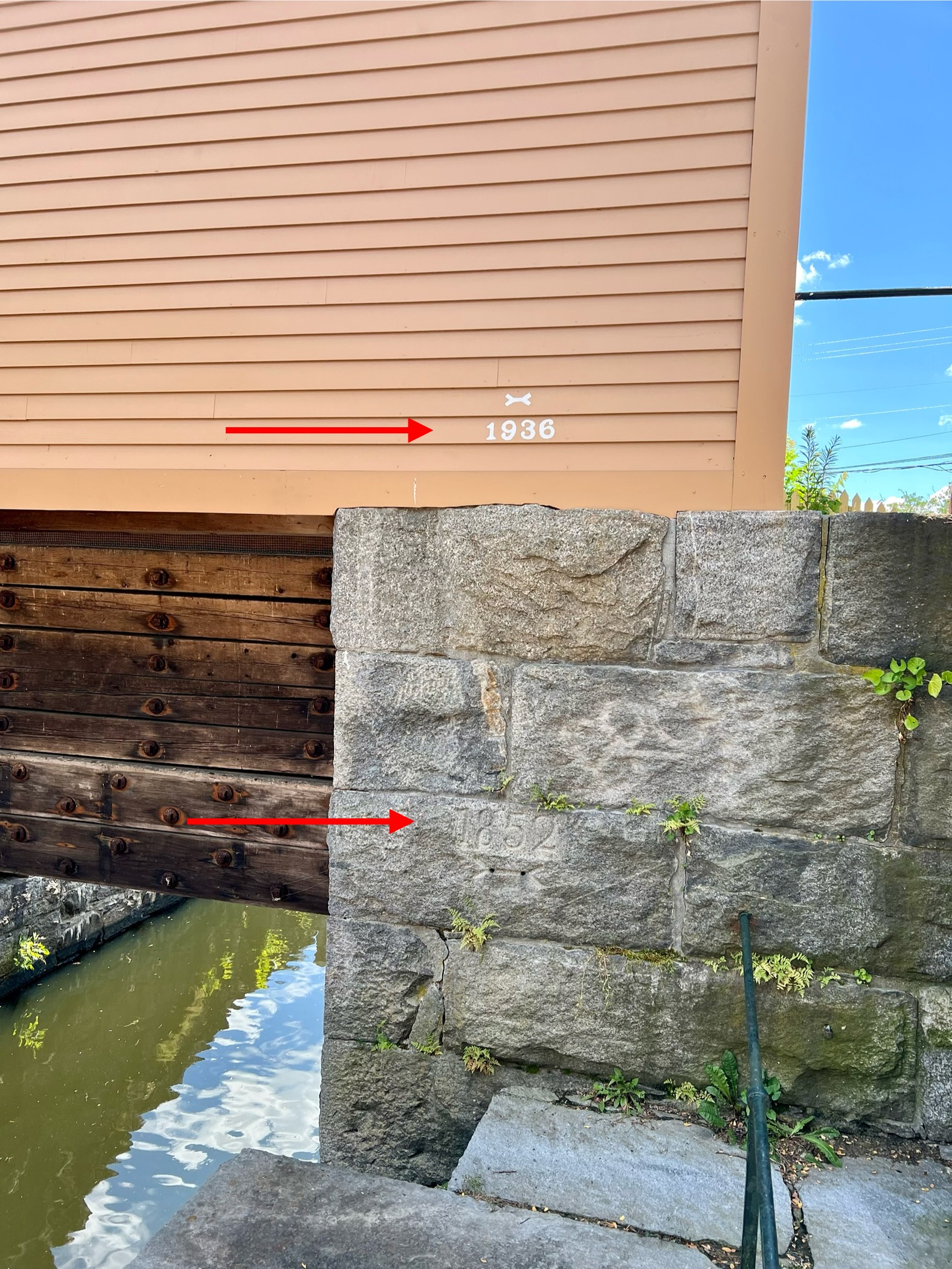from left to right: the Swamp Locks; the Guard Locks; the great “Francis Gate” inside the Guardhouse; the red arrows (added by me) indicate the highwater levels during the 1852 and 1936 floods