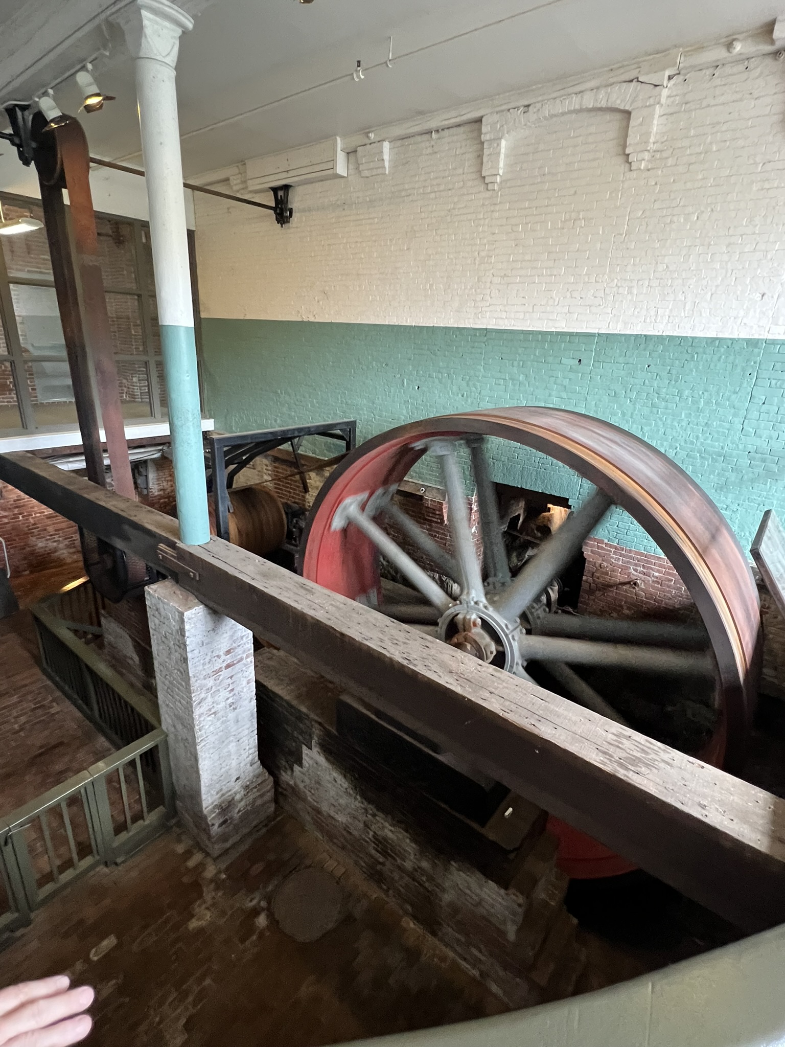 The boat tour ended at 12:30pm with a trolley ride back to the Visitor’s Center. We chose to stay on the trolley, which continued on to the Boott Cotton Mills Museum, so we could catch the 1:00pm Suffolk Mill Tour. The tour is free and registration is not required. The website describes it as “a short trip through the historic city accompanied by a park ranger and a guided visit to the River Transformed Exhibit at the Suffolk Mill.” Our tour went by trolley from the Museum to the Suffolk Mill, but the website cautioned to be prepared for up to 1-1/2 miles of walking, so I imagine the tour sometimes is done on foot. This tour was well worth skipping lunch for. We got to see one of the turbines actually working, along with the associated belts and gears, as well as a demonstration of a power loom and flyball governor in operation.
