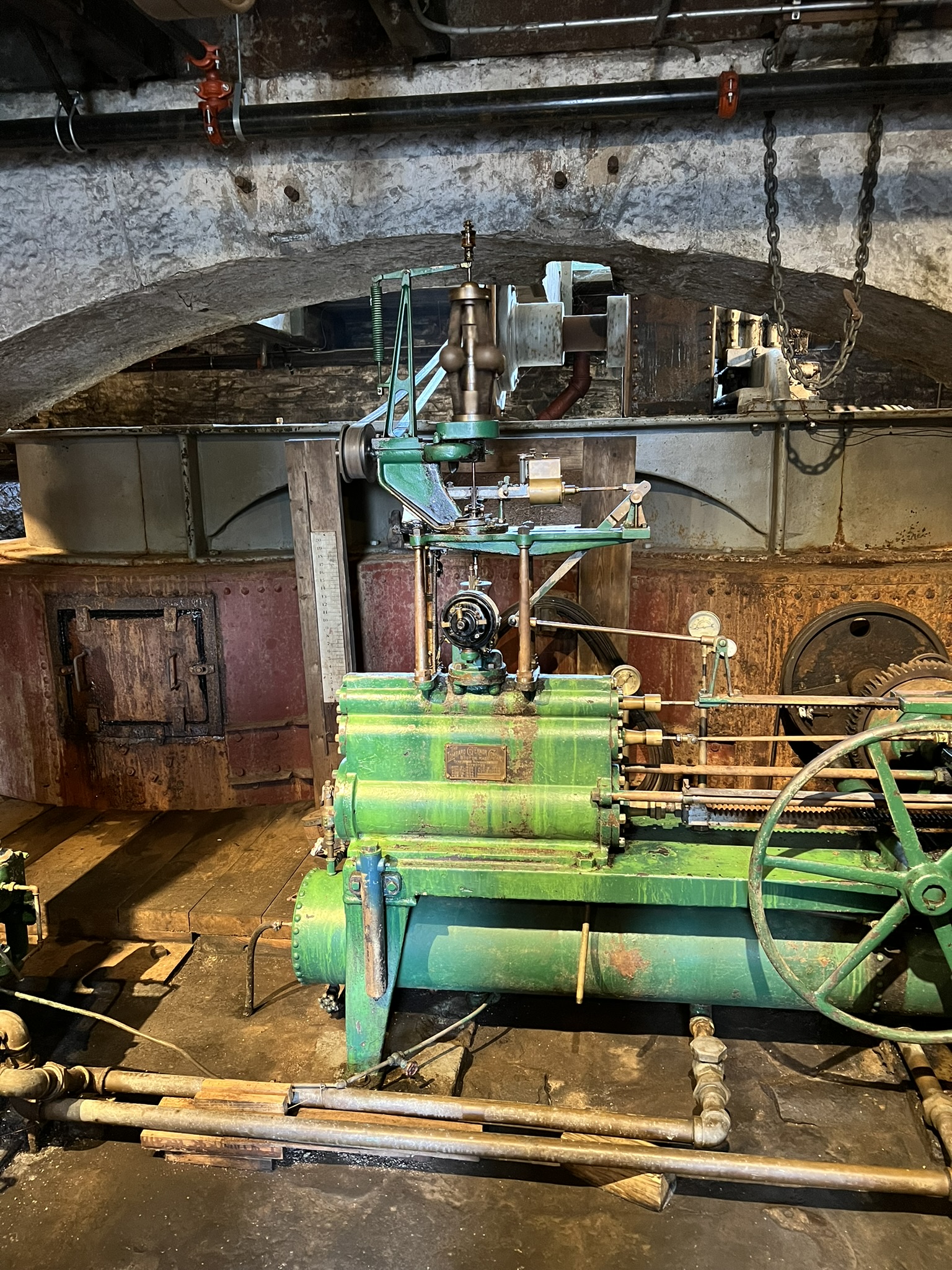 from left to right: view of the Northern Canal with the former Suffolk Mill to the right; a wheel and belt being powered by the turbine shown in the video above; the flyball governor which regulates the flow of water into the turbine.