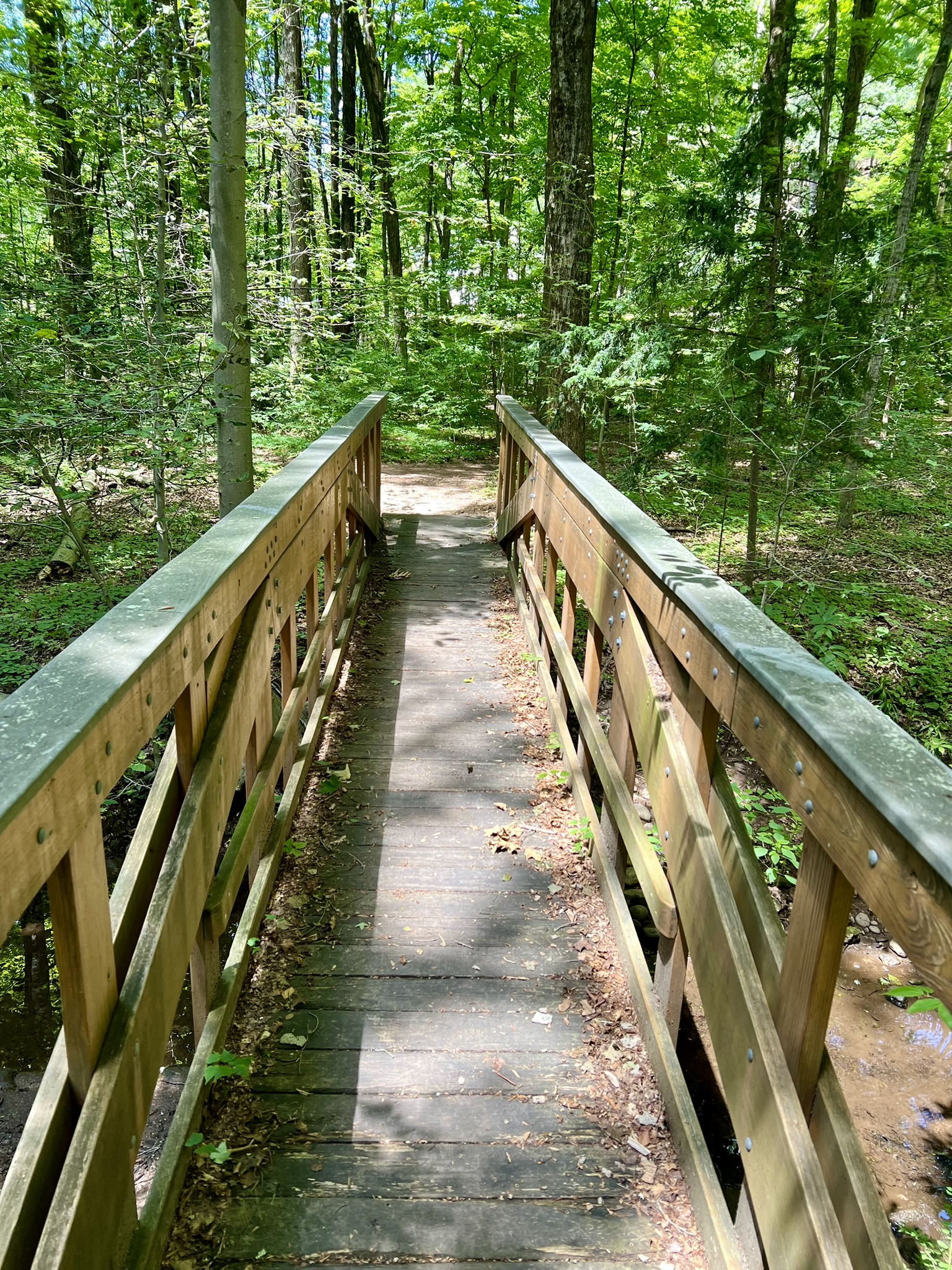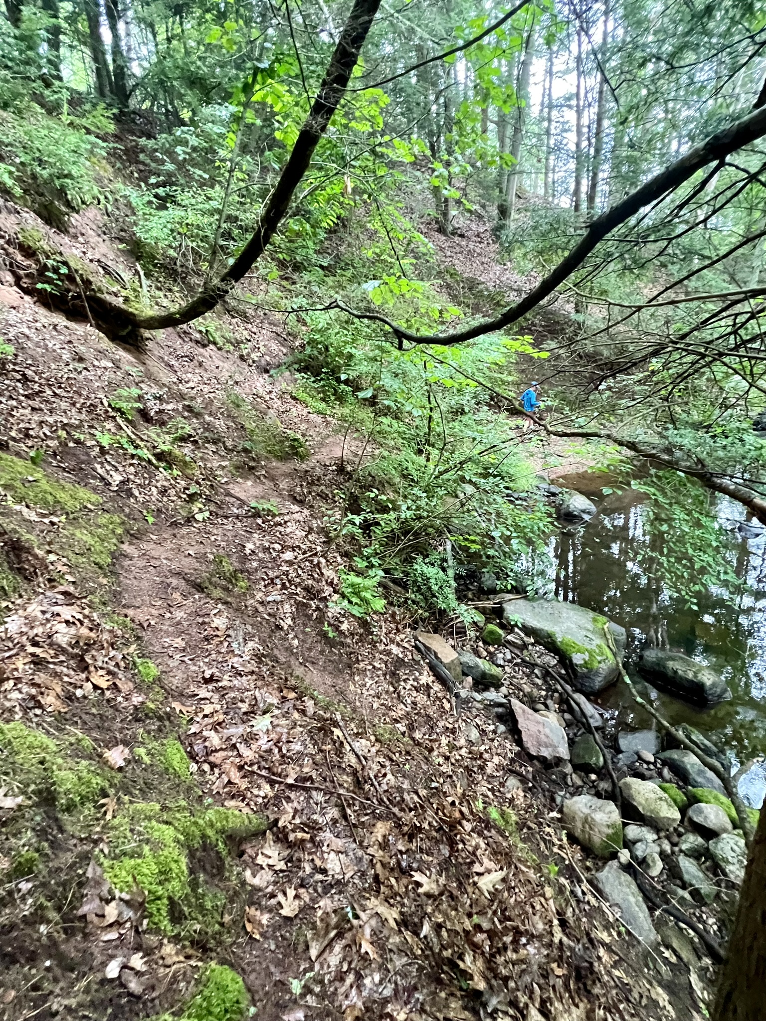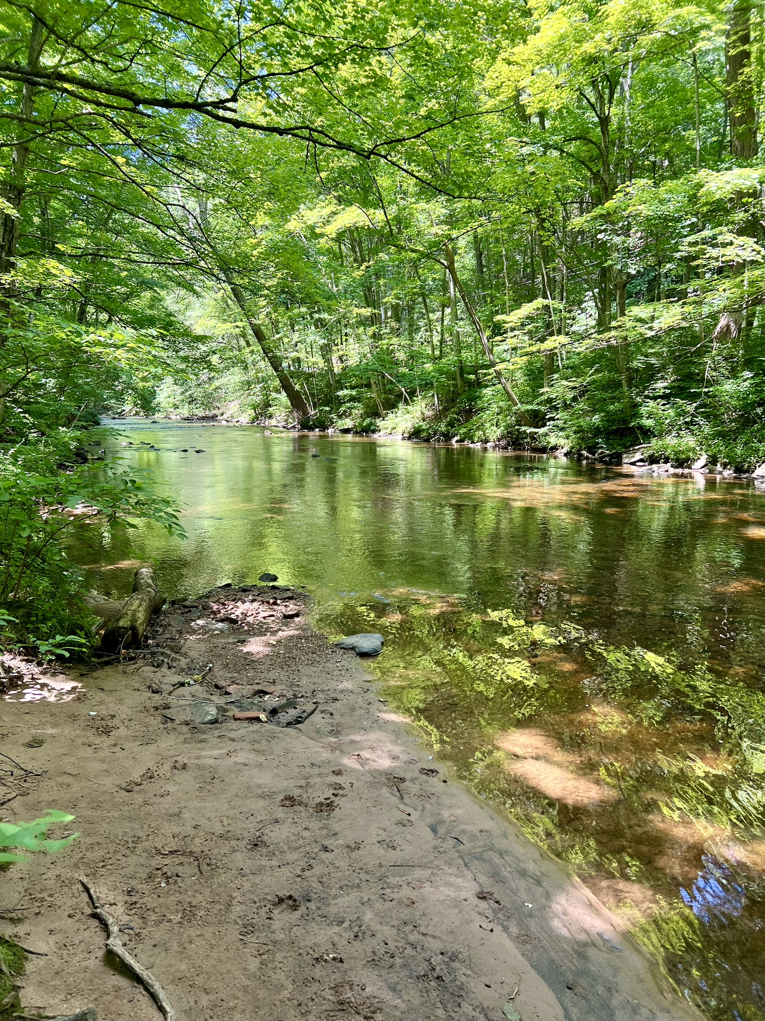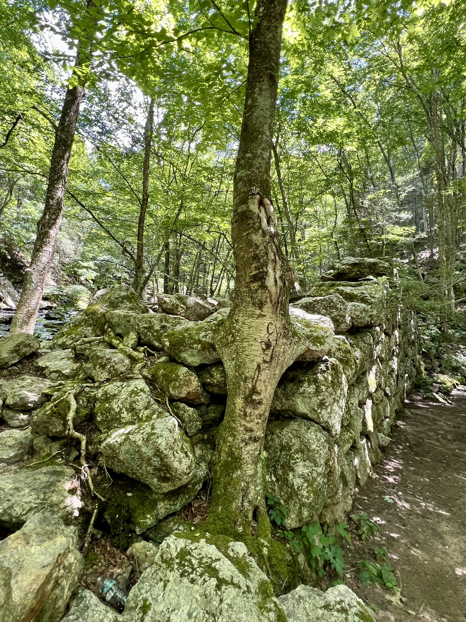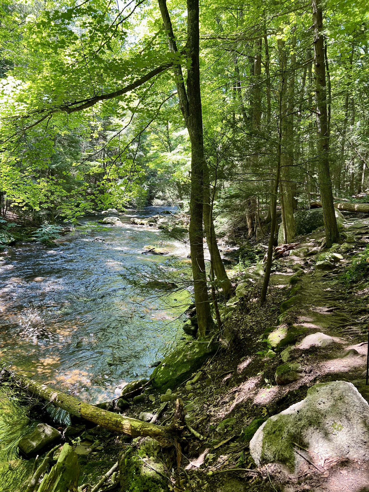 There is a parking lot on Hopewell Road next to the Grange Pool. The path starts by the sign listing the preserve rules and regulations. After a short descent to the brook, it goes along the water past a series of small falls and boulders. The trail is scenic and shady. There are places where the trail is cut into a steeper section of slope, and in combination with tree roots underfoot, please know that this trail is more moderate than easy. The trail dead ends at a higher rock cliff over a pool, which people obviously use as a swimming hole despite the Town’s discouragement. Unfortunately, this end point is also littered with a disappointing amount of trash, as is the short section of trail that leads up to it. This was a very enjoyable hike up until the turnaround point, and hopefully when it reopens people will be more respectful and practice Leave No Trace principles.